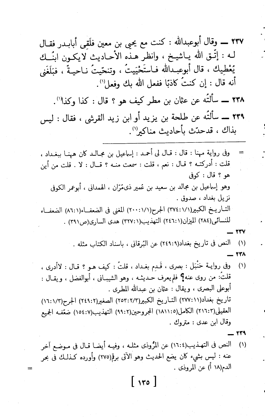 237 - وَقَالَ أَبُو عبد الله: كنت مَعَ يحيى بن معِين فلقي أَبَا بدر , فَقَالَ لَهُ: اتَّقِ الله يَا شيخ، وَانْظُر هَذِه الْأَحَادِيث لَا يكون ابْنك يعطيك، قَالَ أَبُو عبد الله: فَاسْتَحْيَيْت وتنحيت نَاحيَة، فبلغني أَنه قَالَ: إِن كنت كَاذِبًا فَفعل الله بك وَفعل.