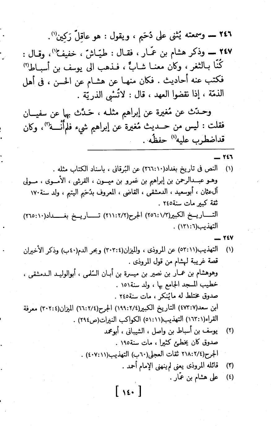 247 - وَذكر هِشَام بن عمار، فَقَالَ: طياش، خَفِيف، وَقَالَ: كُنَّا بالثغر، وَكَانَ مَعنا شَاب، فَذهب إِلَى يُوسُف بن أَسْبَاط , فَكتب عَنهُ أَحَادِيث , فَكَانَ مِنْهَا عَن هِشَام , عَن الْحسن , فِي أهل الذِّمَّة، إِذا نقضوا الْعَهْد، قَالَ: لَا تسبي الذُّرِّيَّة.