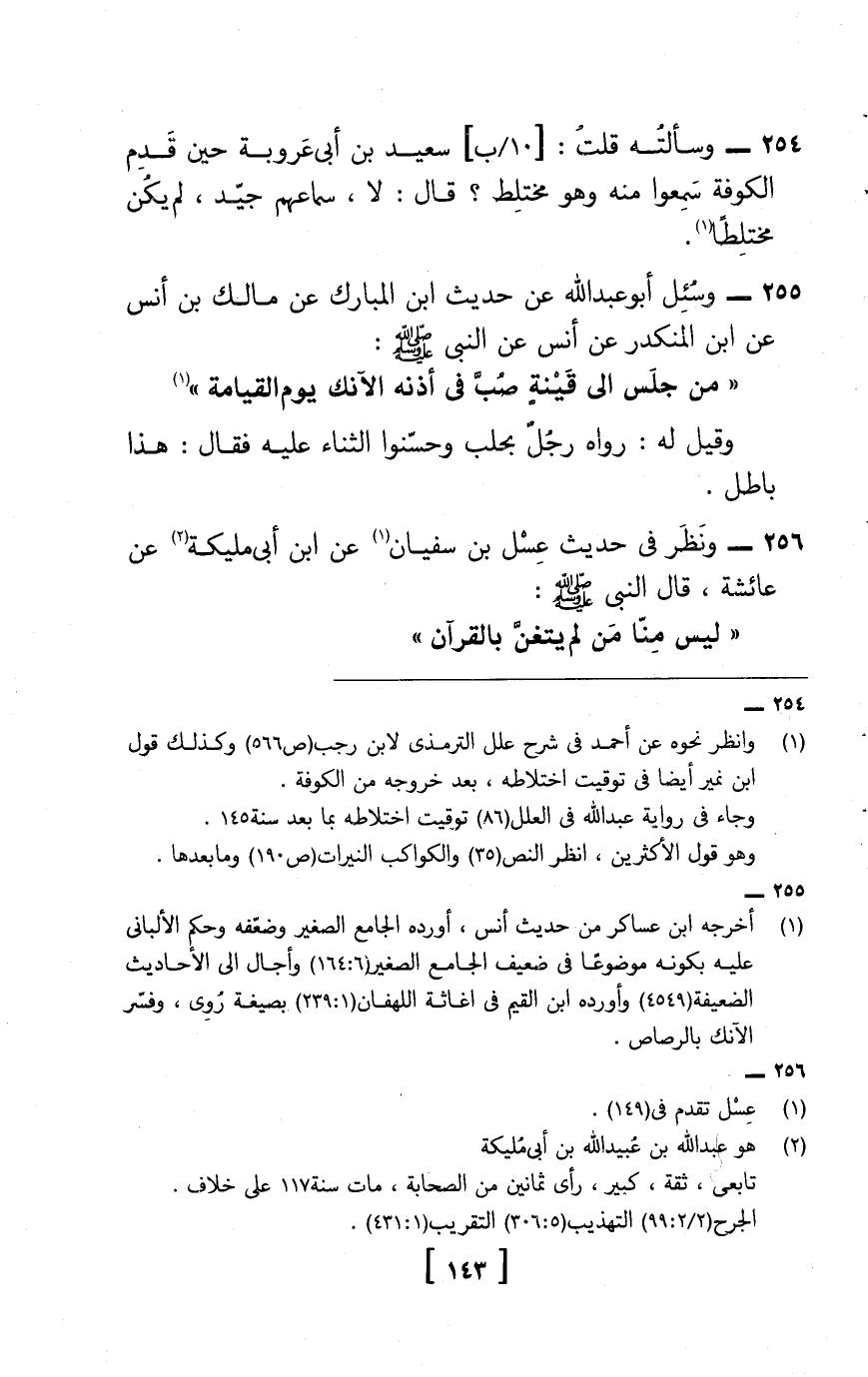 256 - وَنَظَرَ فِي حَدِيثِ عِسْلِ بْنِ سُفْيَانَ , عَنِ ابْنِ أَبِي مُلَيْكَةَ , عَنْ عَائِشَةَ، قَالَ النَّبِيُّ صَلَّى اللَّهُ عَلَيْهِ وَسَلَّمَ: لَيْسَ مِنَّا مَنْ لَمْ يَتَغَنَّ بِالْقُرْآنِ "،
