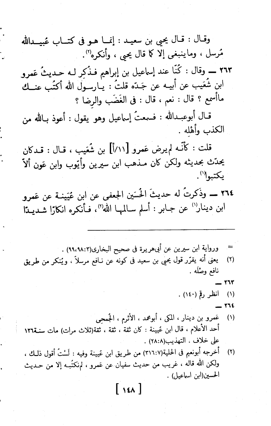 263 - وَقَالَ: كُنَّا عِنْدَ إِسْمَاعِيلَ بْنِ إِبْرَاهِيمَ , فَذُكِرَ لَهُ حَدِيثُ عَمْرِو بْنِ شُعَيْبٍ , عَنْ أَبِيهِ , عَنْ جَدِّهِ , قُلْتُ: يَا رَسُولَ اللَّهِ , أَكْتُبُ عَنْكَ مَا أَسْمَعُ؟ قَالَ: نَعَمْ، قَالَ: فِي الْغَضَبِ وَالرِّضَا؟ ، قَالَ أَبُو عَبْدِ اللَّهِ: فَسَمِعْتُ إِسْمَاعِيلَ , وَهُوَ يَقُولُ: أَعُوذُ بِاللَّهِ مِنَ الْكَذِبِ وَأَهْلِهِ