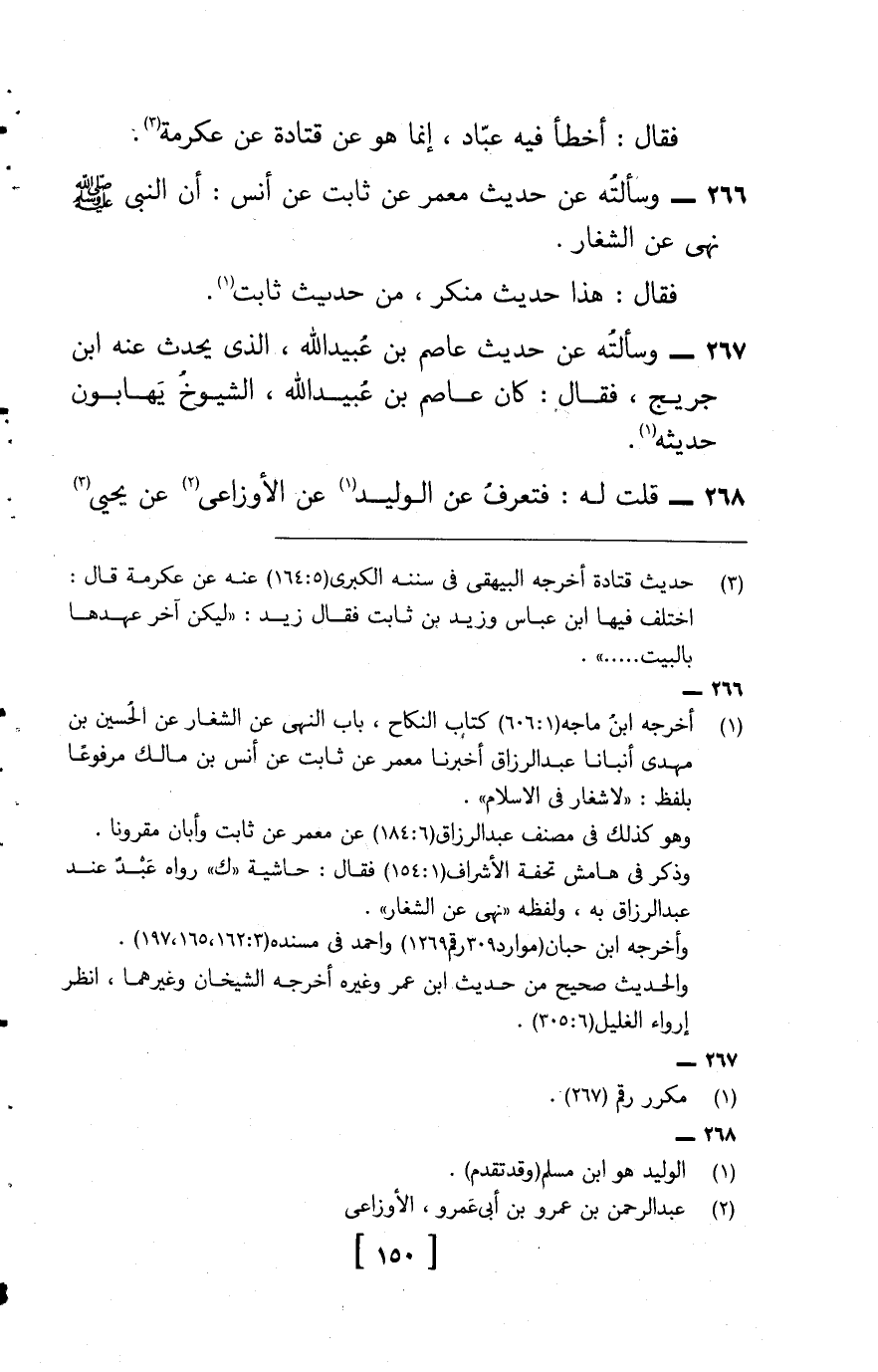 266 - وَسَأَلْتُهُ عَنْ حَدِيثِ مَعْمَرٍ , عَنْ ثَابِتٍ , عَنْ أَنَسٍ , أَنّ النَّبِيَّ صَلَّى اللَّهُ عَلَيْهِ وَسَلَّمَ نَهَى عَنِ الشِّغَارِ فَقَالَ: هَذَا حَدِيثٌ مُنْكَرٌ، مِنْ حَدِيثِ ثَابِتٍ