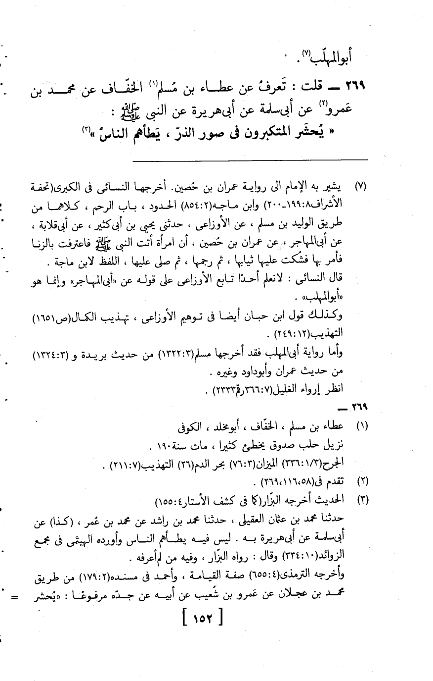 269 - قُلْتُ: تَعْرِفُ عَنْ عَطَاءِ بْنِ مُسْلِمٍ الْخَفَّافِ , عَنْ مُحَمَّدِ بْنِ عَمْرٍو , عَنْ أَبِي سَلَمَةَ , عَنْ أَبِي هُرَيْرَةَ , عَنِ النَّبِيِّ صَلَّى اللَّهُ عَلَيْهِ وَسَلَّمَ: «يُحْشَرُ الْمُتَكَبِّرُونَ فِي صُوَرِ الذَّرِّ، يَطَؤُهُمُ النَّاسُ»
