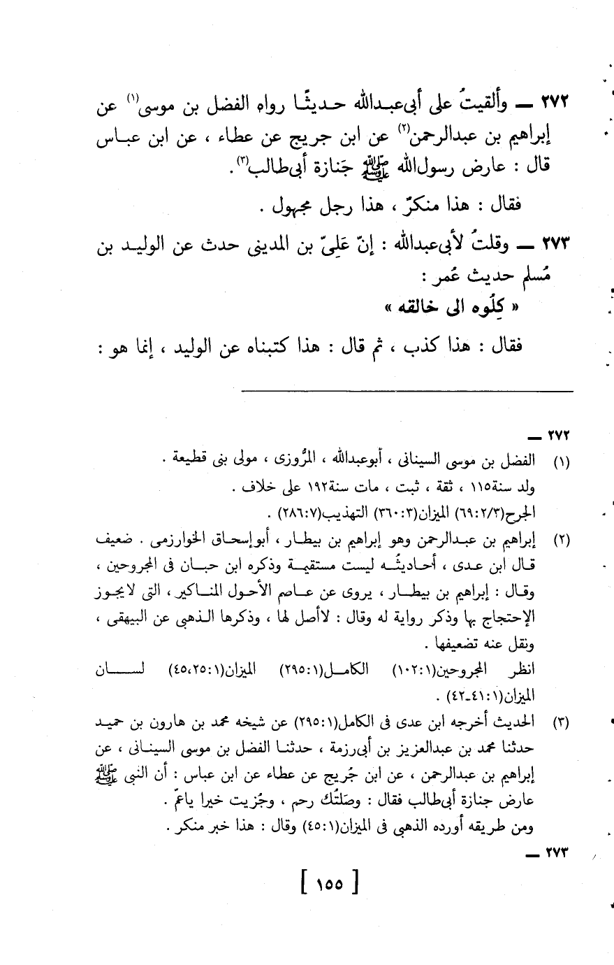 272 - وَأَلْقَيْتُ عَلَى أَبِي عَبْدِ اللَّهِ حَدِيثًا , رَوَاهُ الْفَضْلُ بْنُ مُوسَى , عَنْ إِبْرَاهِيمَ بْنِ عَبْدِ الرَّحْمَنِ , عَن ابْن جريج , عَن عَطاء، عَنِ ابْنِ عَبَّاسٍ , قَالَ: «عَارَضَ رَسُولِ اللَّهِ صَلَّى اللَّهُ عَلَيْهِ وَسَلَّمَ جِنَازَةَ أَبِي طَالِبٍ» , فَقَالَ: هَذَا مُنْكَرٌ، هَذَا رَجُلٌ مَجْهُولٌ