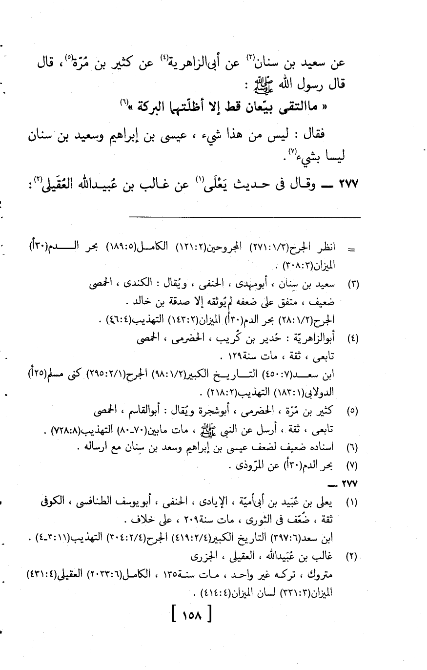عَنْ سَعِيدِ بْنِ سِنَانٍ , عَنْ أَبِي الزَّاهِرِيَّةِ , عَنْ كَثِيرِ بْنِ مُرَّةَ، قَالَ: قَالَ رَسُولُ اللَّهِ صَلَّى اللَّهُ عَلَيْهِ وَسَلَّمَ: مَا الْتَقَى بَيِّعَانِ قَطُّ إِلَّا أَظَلَّتْهُمَا الْبَرَكَةُ , فَقَالَ: لَيْسَ مِنْ هَذَا شَيْءٌ، عِيسَى بْنُ إِبْرَاهِيمَ , وَسَعِيدُ بْنُ سِنَانٍ لَيْسَا بِشَيْءٍ