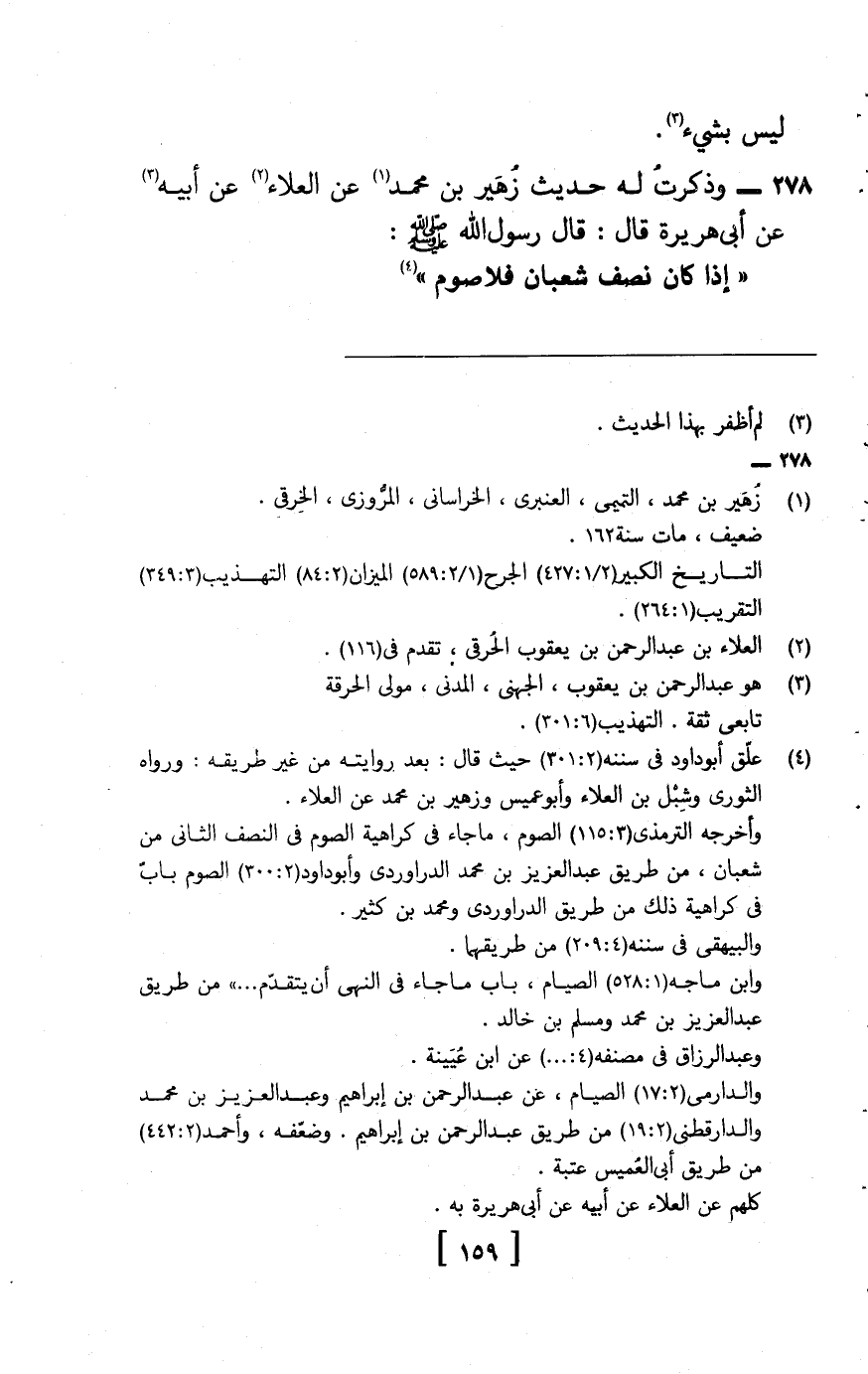278 - وَذَكَرْتُ لَهُ حَدِيثَ زُهَيْرِ بْنِ مُحَمَّدٍ , عَنِ الْعَلَاءِ , عَنْ أَبِيهِ , عَنْ أَبِي هُرَيْرَةَ , قَالَ: قَالَ رَسُولُ اللَّهِ صَلَّى اللَّهُ عَلَيْهِ وَسَلَّمَ: إِذَا كَانَ نِصْفُ شَعْبَانَ فَلَا صَوْمَ ,