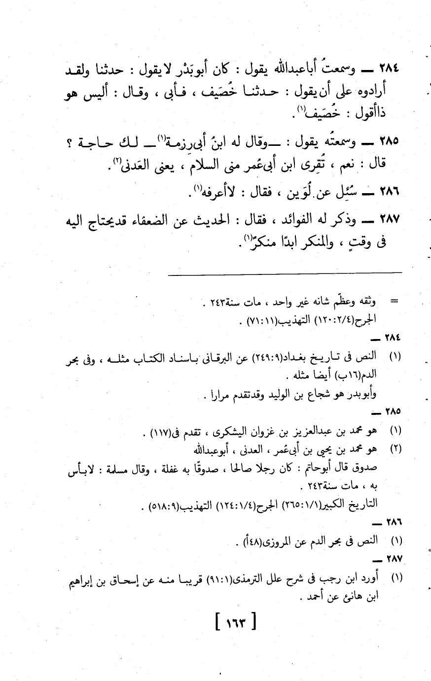 284 - وَسمعت أَبَا عبد الله , يَقُول: كَانَ أَبُو بدر لَا يَقُول حَدثنَا , وَلَقَد أرادوه على أَن يَقُول حَدثنَا خصيف، فَأبى، وَقَالَ: أَلَيْسَ هُوَ ذَا أَقُول: خصيف.