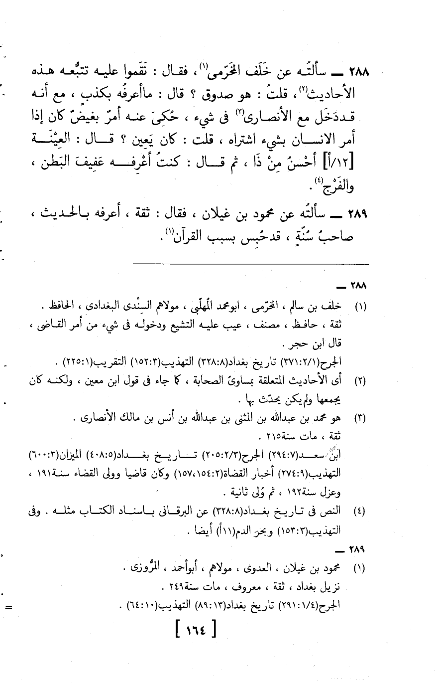 289 - سَأَلته عَن مَحْمُود بن غيلَان، فَقَالَ: ثِقَة، أعرفهُ بِالْحَدِيثِ، صَاحب سنة، قد حبس بِسَبَب الْقُرْآن.