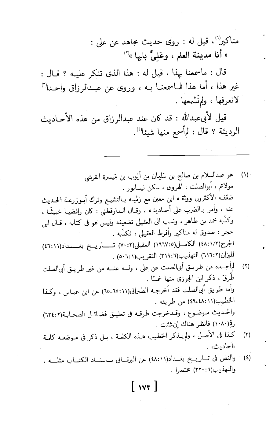 مَنَاكِير، قيل لَهُ: روى حَدِيث مُجَاهِد عَن عَليّ: أَنا مَدِينَة الْعلم، وَعلي بَابهَا قَالَ: مَا سمعنَا بِهَذَا، قيل لَهُ: هَذَا الَّذِي تنكر عَلَيْهِ؟ قَالَ: غير هَذَا، أما هَذَا فَمَا سمعنَا بِهِ، وروى عَن عبد الرازق وَاحِدًا لَا نعرفها، وَلم نسمعها.
