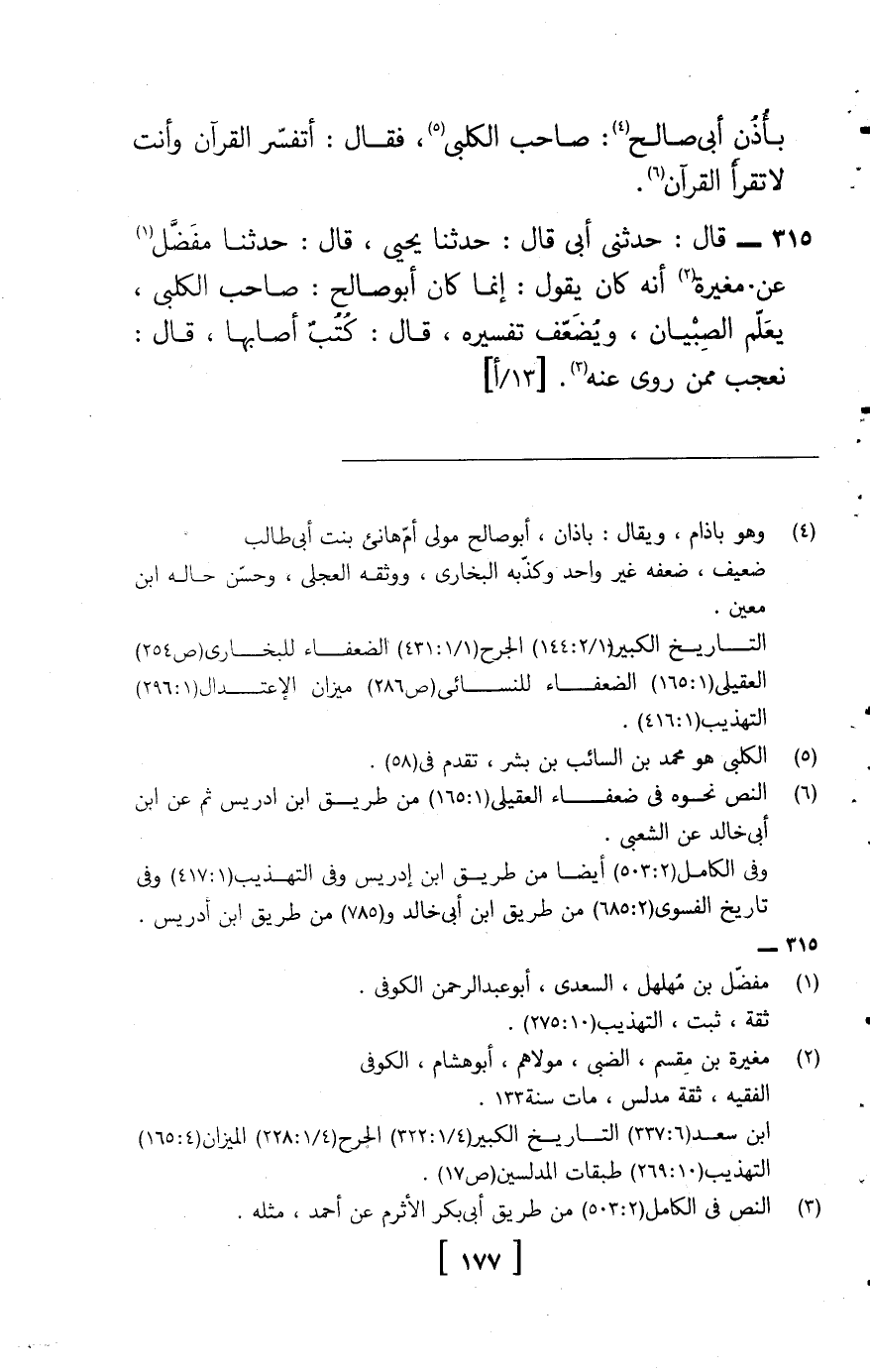 315 - قَالَ: حَدثنِي أبي , قَالَ: حَدثنَا يحيى، قَالَ: حَدثنَا مفضل , عَن مُغيرَة , أَنه كَانَ يَقُول: إِنَّمَا كَانَ أَبُو صَالح صَاحب الْكَلْبِيّ، يعلم الصّبيان، ويضعف تَفْسِيره، قَالَ: كتبت أَصَابَهَا، قَالَ: نعجب مِمَّن روى عَنهُ.