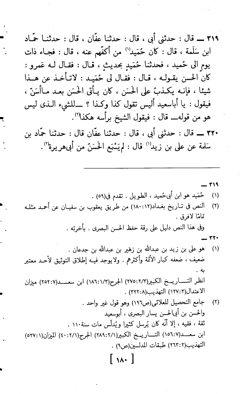 319 - قَالَ حَدثنِي أبي، قَالَ: حَدثنَا عَفَّان، قَالَ: حَدثنَا حَمَّاد بن سَلمَة، قَالَ: كَانَ حميد من أكفهم عَنهُ، قَالَ: فجَاء ذَات يَوْم إِلَى حميد، فحدثنا حميد بِحَدِيث، قَالَ: فَقَالَ لَهُ عَمْرو: كَانَ الْحسن يَقُوله، قَالَ: فَقَالَ لي حميد لَا تَأْخُذ عَن هَذَا شَيْئا، فَإِنَّهُ يكذب على الْحسن، كَانَ يَأْتِي الْحسن بَعْدَمَا أسن، فَيَقُول: يَا أَبَا سعيد , أَلَيْسَ تَقول كَذَا وَكَذَا؟ للشَّيْء الَّذِي لَيْسَ هُوَ من قَوْله , قَالَ: فَيَقُول الشَّيْخ: بِرَأْسِهِ هَكَذَا.