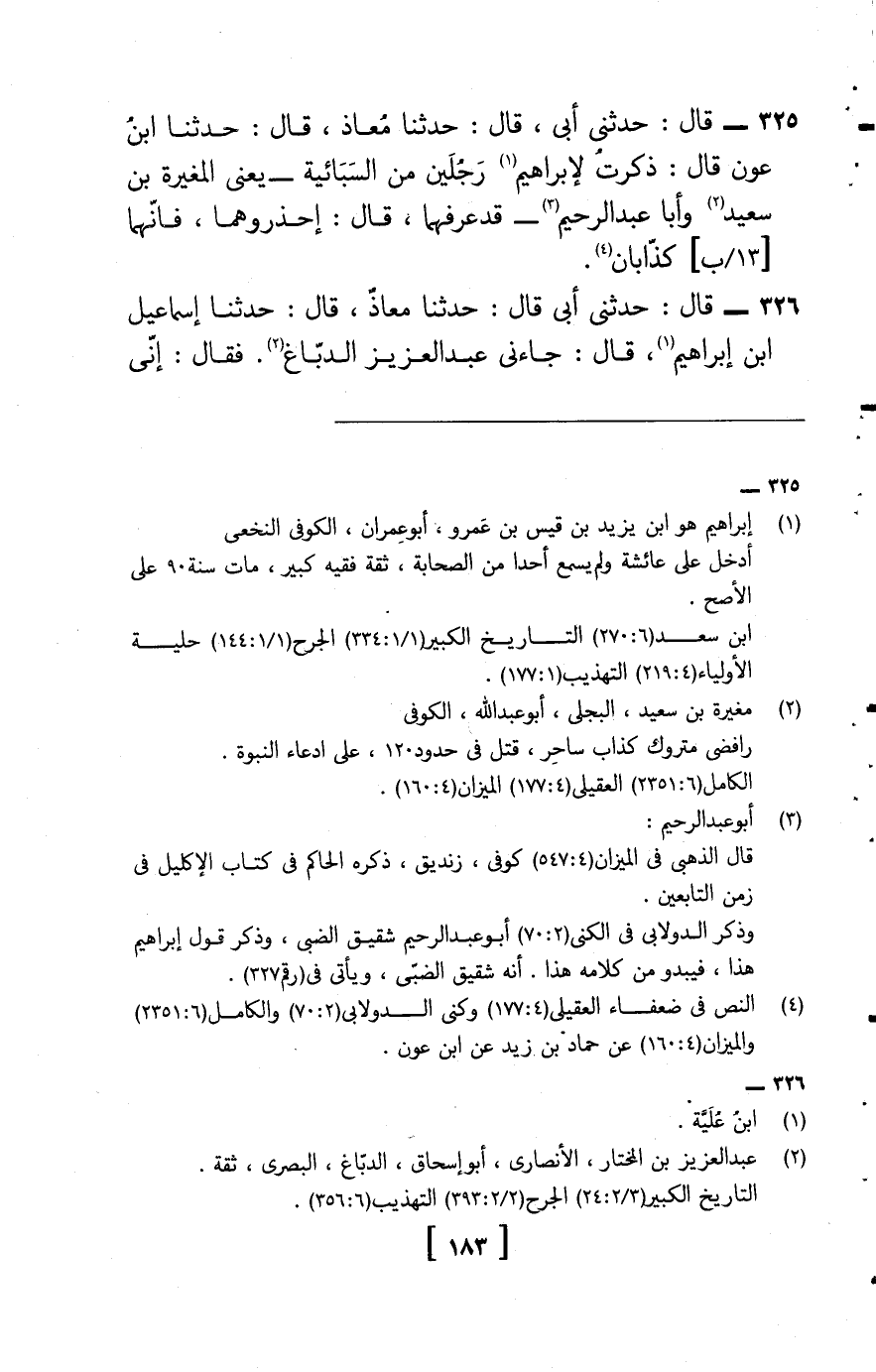 325 - قَالَ حَدثنِي أبي، قَالَ: حَدثنَا معَاذ، قَالَ، حَدثنَا ابْن عون , قَالَ: ذكرت لإِبْرَاهِيم رجلَيْنِ من السبائية , يَعْنِي الْمُغيرَة بن سعيد , وَأَبا عبد الرَّحِيم , قد عرفهما، قَالَ: احذروهما، فَإِنَّهُمَا كذابان.