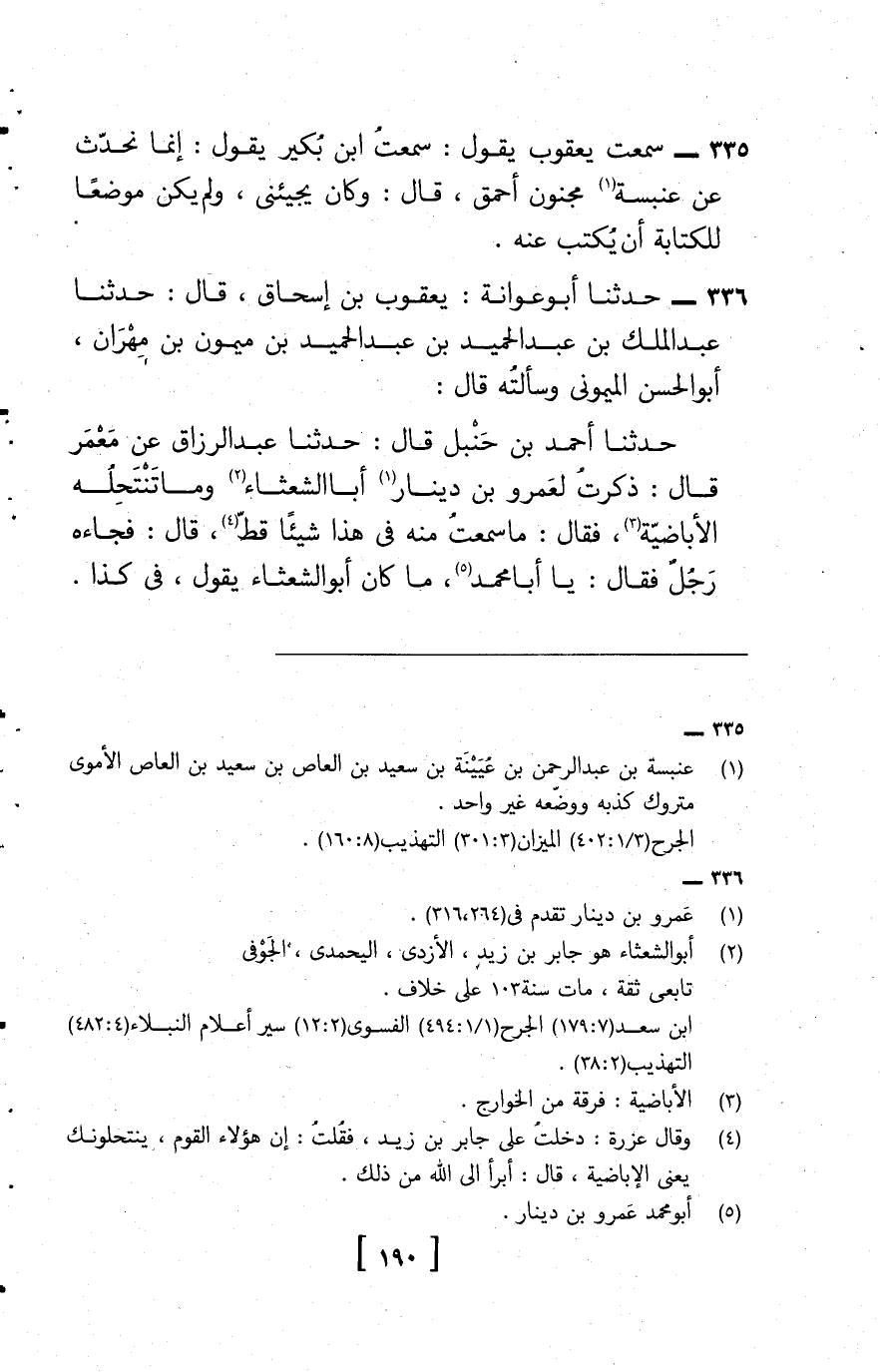 336 - حَدَّثَنَا أَبُو عوَانَة يَعْقُوب بن إِسْحَاق، قَالَ: حَدَّثَنَا عَبْدُ الْمَلِكِ بْنُ عَبْدِ الْحَمِيدِ بْنِ عَبْدِ الْحَمِيدِ بْنِ مَيْمُونِ بْنِ مِهْرَانَ أَبُو الْحَسَنِ الْمَيْمُونِيُّ , وَسَأَلْتُهُ , قَالَ: حَدَّثَنَا أَحْمَدُ بْنُ حَنْبَلٍ , قَالَ: حَدَّثَنَا عَبْدُ الرَّزَّاقِ , عَنْ مَعْمَرٍ , قَالَ: ذَكَرْتُ لِعَمْرِو بْنِ دِينَارٍ أَبَا الشَّعْثَاءِ , وَمَا تَنْتَحِلُهُ الْإِبَاضِيَّةُ، فَقَالَ: مَا سَمِعْتُ مِنْهُ فِي هَذَا شَيْئًا قَطُّ، قَالَ: فَجَاءَ رَجُلٌ , فَقَالَ: يَا أَبَا مُحَمَّدٍ، مَا كَانَ أَبُو الشَّعْثَاءِ يَقُولُ فِي كَذَا ,