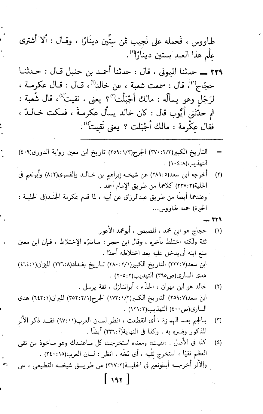 339 - حَدثنَا الْمَيْمُونِيّ. قَالَ: حَدثنَا أَحْمد بن حَنْبَل , قَالَ: حَدثنَا حجاج، قَالَ: سَمِعت شُعْبَة، عَن خَالِد، قَالَ: قَالَ عِكْرِمَة، لرجل وَهُوَ يسْأَله: مَا لَك أجبلت؟ يَعْنِي نفيت، قَالَ شُعْبَة: ثمَّ حَدثنِي أَيُّوب , قَالَ: كَانَ خَالِد يسْأَل عِكْرِمَة، فَسكت خَالِد، فَقَالَ عِكْرِمَة: مَا لَك أجلبت؟ يَعْنِي نقيت.