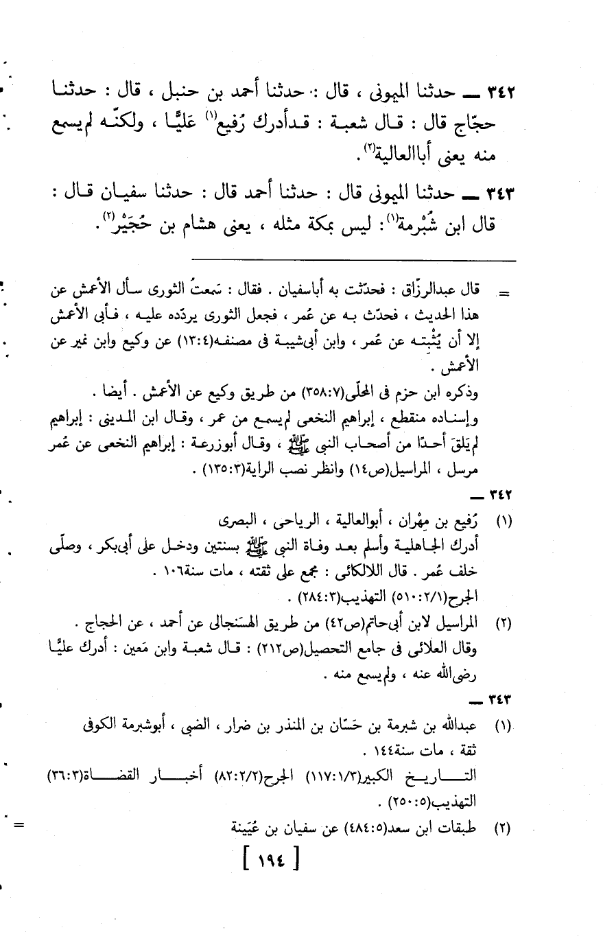 342 - حَدثنَا الْمَيْمُونِيّ، قَالَ: حَدثنَا أَحْمد بن حَنْبَل، قَالَ: حَدثنَا حجاج , قَالَ: قَالَ شُعْبَة: قد أدْرك رفيع عليا، وَلكنه لم يسمع مِنْهُ , يَعْنِي أَبَا الْعَالِيَة.