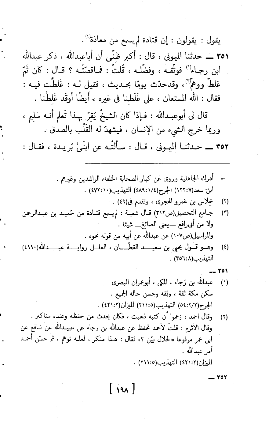 351 - حَدثنَا الْمَيْمُونِيّ، قَالَ: أكبر ظَنِّي أَن أَبَا عبد الله ذكر عبد الله بن رَجَاء , فوثقه وفضله، قلت: فَمَا قصَّته؟ قَالَ: كَانَ ثمَّ غلط , وَوهم وَقد حدث يَوْمًا بِحَدِيث، فَقيل لَهُ: غَلطت فِيهِ , فَقَالَ: الله الْمُسْتَعَان، على غلطنا فِي غَيره، أَيْضا أَو قد غلطنا.