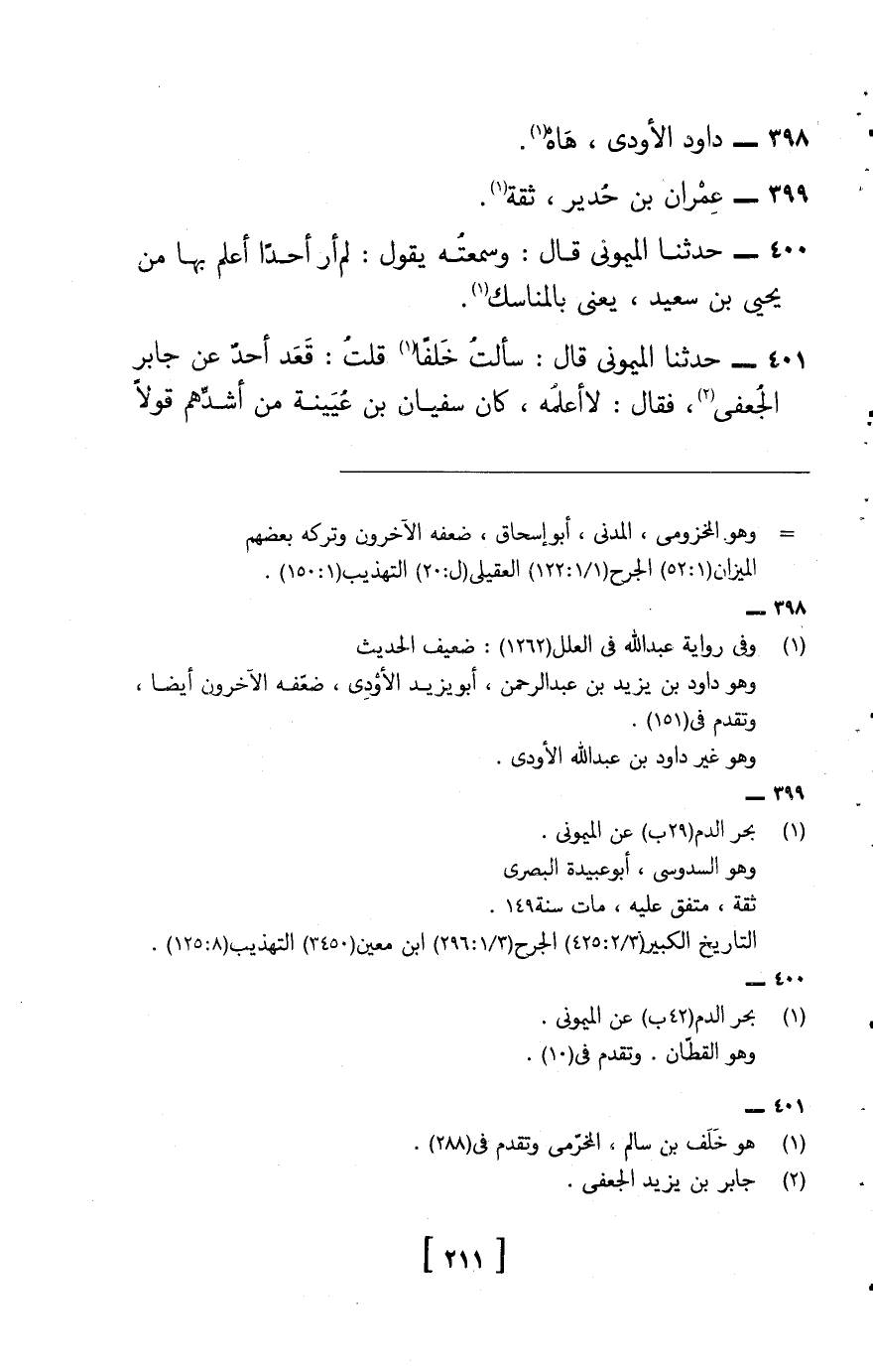 401 - حَدثنَا الْمَيْمُونِيّ , قَالَ: سَأَلت خلفا , قلت: قعد أحد عَن جَابر الْجعْفِيّ، فَقَالَ: لَا أعلمهُ، كَانَ سُفْيَان بن عُيَيْنَة من أَشَّدهم قولا