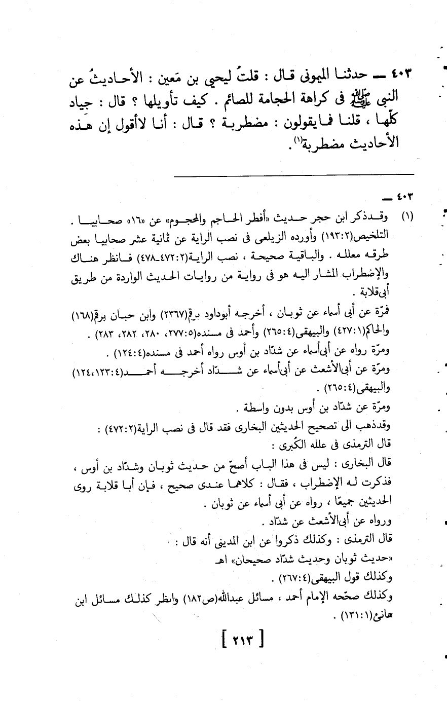 403 - حَدثنَا الْمَيْمُونِيّ , قَالَ: قلت ليحيى بن معِين: الْأَحَادِيث عَن النَّبِي صلى الله عَلَيْهِ وَسلم فِي كَرَاهَة الْحجامَة للصَّائِم , كَيفَ تَأْوِيلهَا؟ قَالَ: جِيَاد كلهَا، قُلْنَا فَمَا يَقُولُونَ: مضطربة؟ قَالَ.