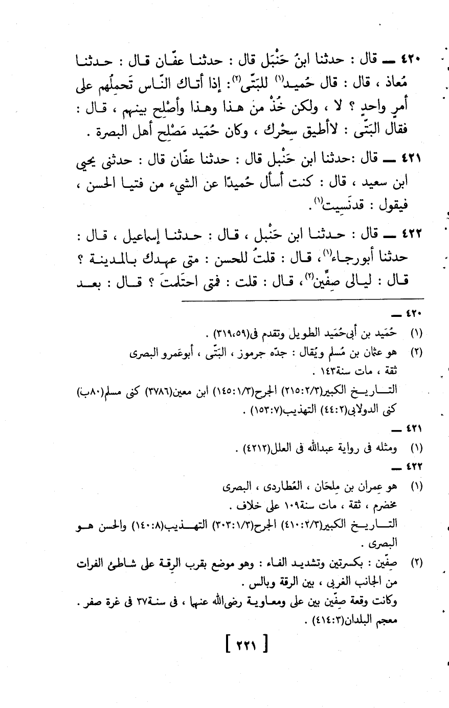 422 - قَالَ حَدثنَا ابْن حَنْبَل، قَالَ: حَدثنَا إِسْمَاعِيل، قَالَ: حَدثنَا أَبُو رَجَاء، قَالَ: قلت لِلْحسنِ: متي عَهْدك بِالْمَدِينَةِ؟ قَالَ: ليَالِي صفّين، قَالَ: قلت: فَمَتَى احتملت؟ قَالَ: بعد
