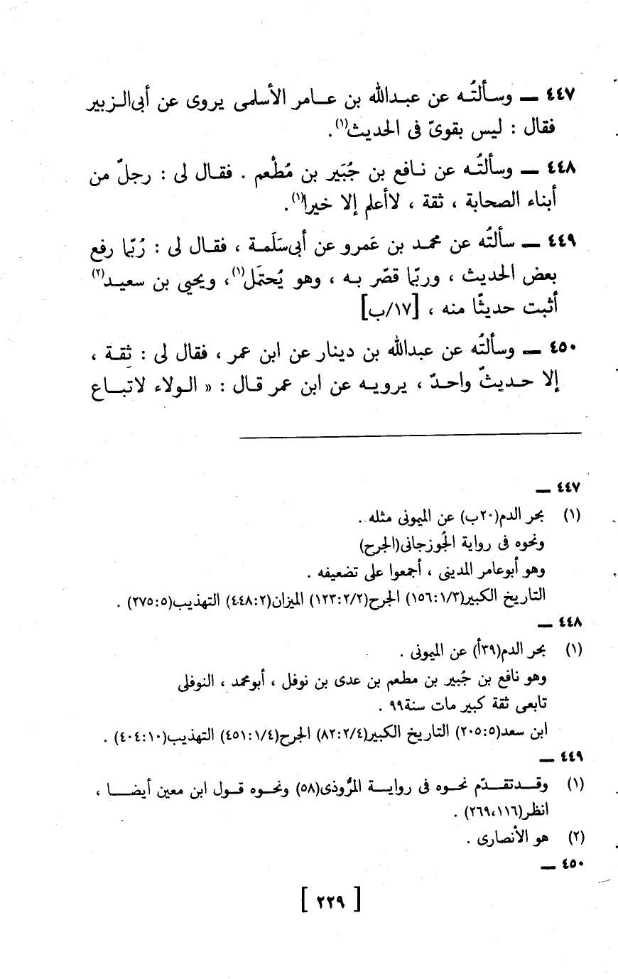 448 - وَسَأَلته عَن نَافِع بن جُبَير بن مطعم , فَقَالَ لي: رجل من أنباء الصَّحَابَة، ثِقَة، لَا أعلم إِلَّا خيرا.