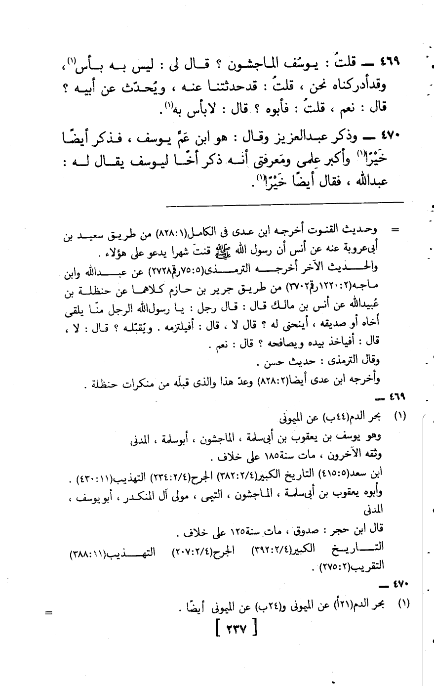 469 - قلت: يُوسُف الْمَاجشون؟ قَالَ لي: لَيْسَ بِهِ بَأْس، وَقد أدركناه نَحن، قلت: قد حَدَّثتنَا عَنهُ، وَيحدث عَن أَبِيه؟ قَالَ: نعم، قلت: فأبوه؟ قَالَ: لَا بَأْس بِهِ.