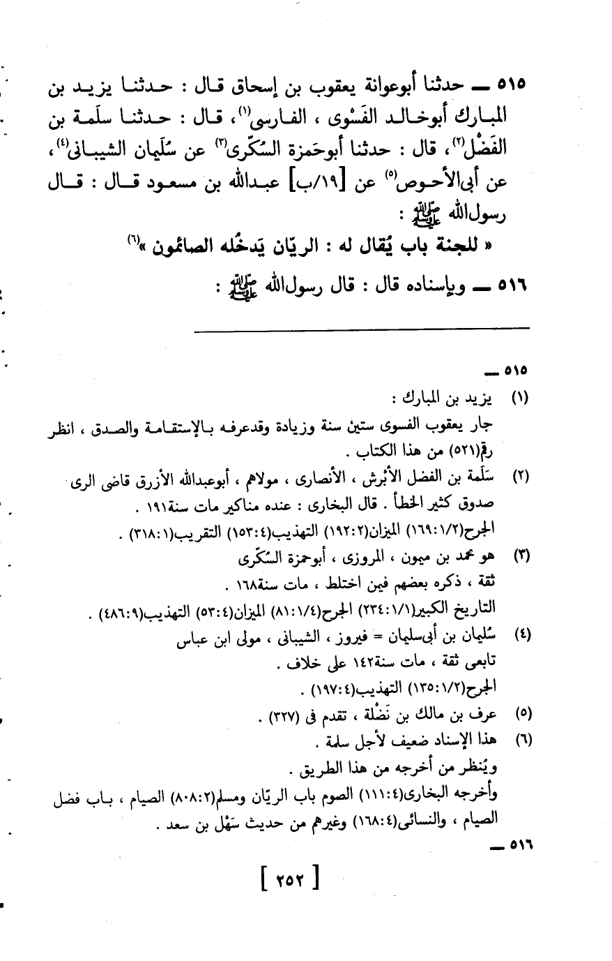 515 - حَدثنَا أَبُو عوَانَة يَعْقُوب بن إِسْحَاقَ , قَالَ: حَدَّثَنَا يَزِيدُ بْنُ الْمُبَارَكِ أَبُو خَالِدٍ الْفَسَوِيُّ الْفَارِسِيُّ، قَالَ: حَدَّثَنَا سَلَمَةُ بْنُ الْفَضْلِ، قَالَ: حَدَّثَنَا أَبُو حَمْزَةَ السُّكَّرِيُّ , عَنْ سُلَيْمَانَ الشَّيْبَانِيِّ , عَنْ أَبِي الْأَحْوَصِ , عَنْ عَبْدِ اللَّهِ بْنِ مَسْعُودٍ , قَالَ: قَالَ رَسُولُ اللَّهِ صَلَّى اللَّهُ عَلَيْهِ وَسَلَّمَ: لِلْجَنَّةِ بَابٌ يُقَالُ لَهُ: الرَّيَّانُ يَدْخُلُهُ الصَّائِمُونَ