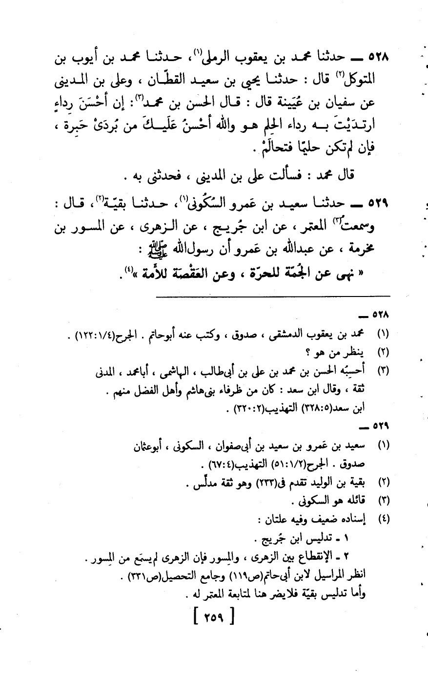 529 - حَدَّثَنَا سَعِيدُ بْنُ عَمْرٍو السَّكُونِيُّ، حَدَّثَنِي بَقِيَّةُ، قَالَ: وَسَمِعْتُ الْمُعْتَمِرَ، عَنِ ابْنِ جُرَيْجٍ، عَنِ الزُّهْرِيِّ، عَنِ الْمِسْوَرِ بْنِ مَخْرَمَةَ، عَن عبد الله بن عَمْرو , أَنّ رَسُولَ اللَّهُ صَلَّى اللَّهُ عَلَيْهِ وَسَلَّمَ: نَهَى عَنِ الْجَمَّةِ لِلْحُرَّةِ، وَعَنِ الْعَقْصَةِ لِلْأَمَةِ