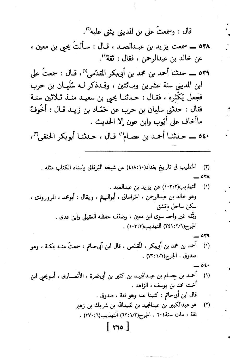 538 - سَمِعت يزِيد بن عبد الصَّمد، قَالَ: سَأَلت يحيى بن معِين، عَن خَالِد بن عبد الرَّحْمَن، فَقَالَ: ثِقَة.