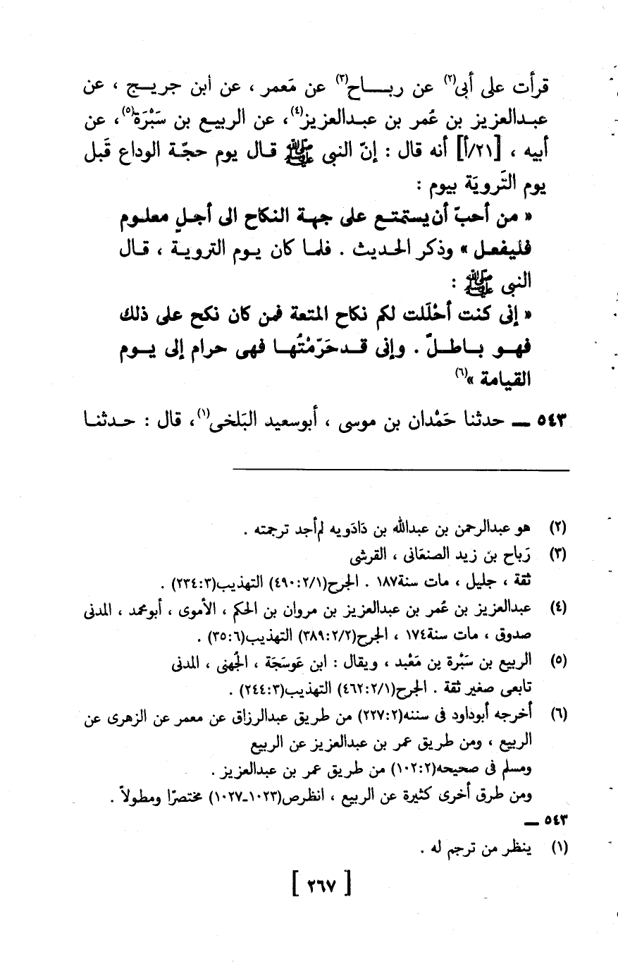 قَرَأْتُ عَلَى أَبِي , عَنْ رَبَاحٍ , عَنْ مَعْمَرٍ، عَنِ ابْنِ جُرَيْجٍ، عَنْ عَبْدِ الْعَزِيزِ بْنِ عُمَرَ بْنِ عَبْدِ الْعَزِيزِ، عَنِ الرَّبِيعِ بْنِ سَبْرَةَ، عَنْ أَبِيهِ , أَنَّهُ قَالَ: إِنَّ النَّبِيَّ صَلَّى اللَّهُ عَلَيْهِ وَسَلَّمَ: قَالَ يَوْمَ حَجَّةِ الْوَدَاعِ قَبْلَ يَوْمِ التَّرْوِيَةِ بِيَوْمٍ: مَنْ أَحَبَّ بِأَنْ يَسْتَمْتِعَ عَلَى جِهَةِ النِّكَاحِ إِلَى أَجَلٍ مَعْلُومٍ فَلْيَفْعَلْ , وَذَكَرَ الْحَدِيثَ.