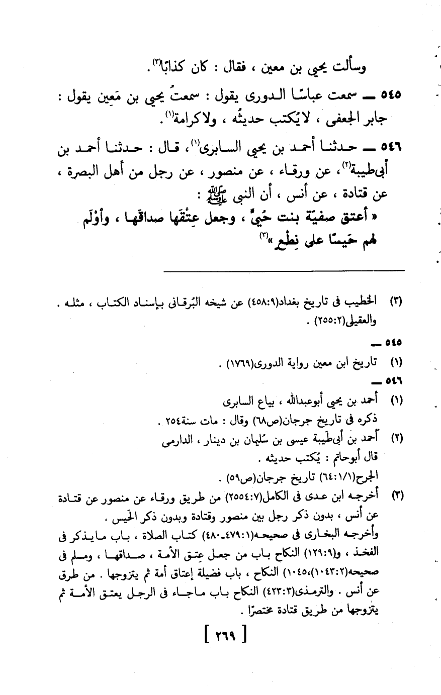 545 - سَمِعت عباسا الدوري , يَقُول: سَمِعت يحيى بن معِين , يَقُول: جَابر الْجعْفِيّ، لَا يكْتب حَدِيثه، وَلَا كَرَامَة.
