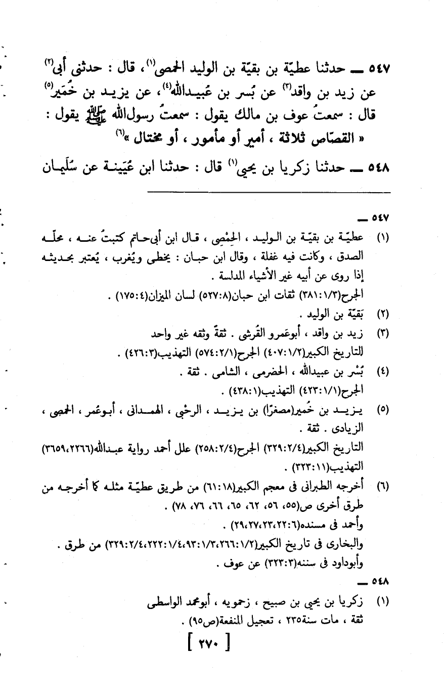 547 - حَدَّثَنَا عَطِيَّةُ بْنُ بَقِيَّةَ بْنِ الْوَلِيدِ الْحِمْصُيِّ، قَالَ: حَدَّثَنِي أَبِي , عَنْ زَيْدِ بْنِ وَاقِدٍ , عَنْ بُسْرِ بْنِ عُبَيْدِ اللَّهِ، عَنْ يَزِيدَ بْنِ خُمَيْرٍ , قَالَ: سَمِعْتُ عَوْفَ بْنَ مَالِكٍ , يَقُولُ: سَمِعْتُ رَسُولِ اللَّهِ صَلَّى اللَّهُ عَلَيْهِ وَسَلَّمَ , يَقُولُ: الْقُصَّاصُ ثَلَاثَةٌ: أَمِيرٌ أَوْ مَأْمُورٌ , أَوْ مُخْتَالٌ