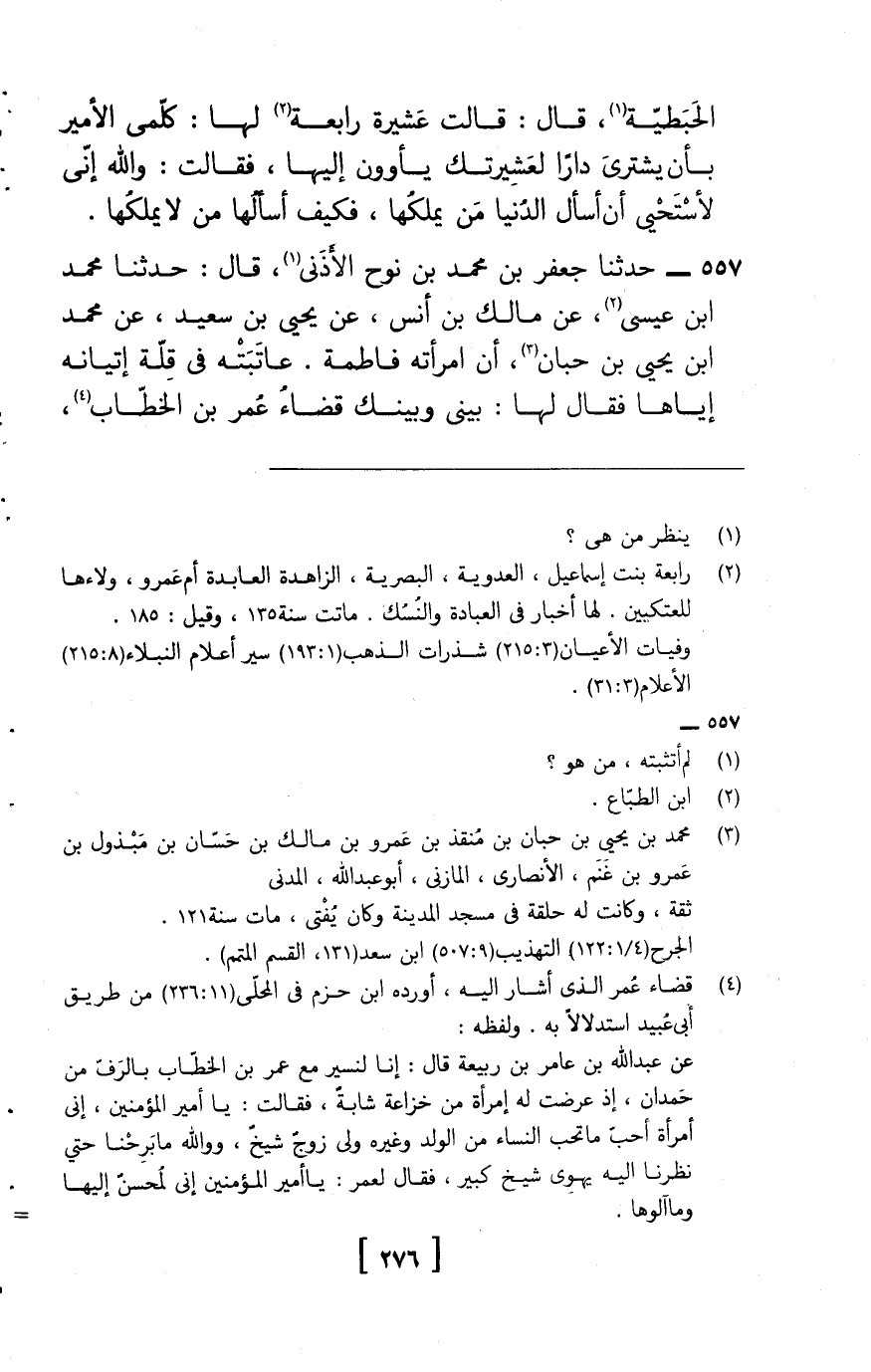 557 - حَدَّثَنَا جَعْفَرُ بْنُ مُحَمَّدِ بْنِ نُوحٍ الأَذَنِيُّ، قَالَ: حَدَّثَنَا مُحَمَّدُ بْنُ عِيسَى، عَنْ مَالِكِ بْنِ أَنَسٍ، عَنِ يَحْيَى بْنِ سَعِيدٍ، عَنْ مُحَمَّدِ بْنِ يَحْيَى بْنِ حِبَّانَ، " أَنَّ امْرَأَتَهُ فَاطِمَةَ عَاتَبَتْهُ فِي قِلَّةِ إِتْيَانِهِ إِيَّاهَا , فَقَالَ لَهَا: بَيْنِي وَبَيْنَكِ قَضَاءُ عُمَرَ بْنِ الْخَطَّابِ،