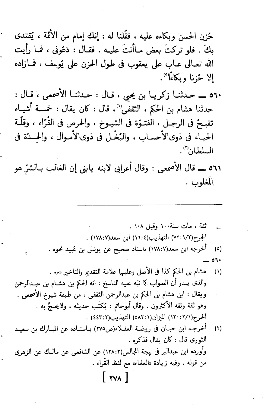 560 - حَدثنَا زَكَرِيَّا بن يحيى، قَالَ: حَدثنَا الْأَصْمَعِي، قَالَ: حَدثنِي هِشَام بن الحكم الثَّقَفِيّ , قَالَ: كَانَ يُقَال خَمْسَة أَشْيَاء تقبح فِي الرجل: الفتوة فِي الشُّيُوخ , والحرص عِلّة الْقُرَّاء , وَقلة الْحَيَاة فِي ذَوي الْحساب وَالْبخل فِي ذَوي الْأَمْوَال , والحدة فِي السُّلْطَان.