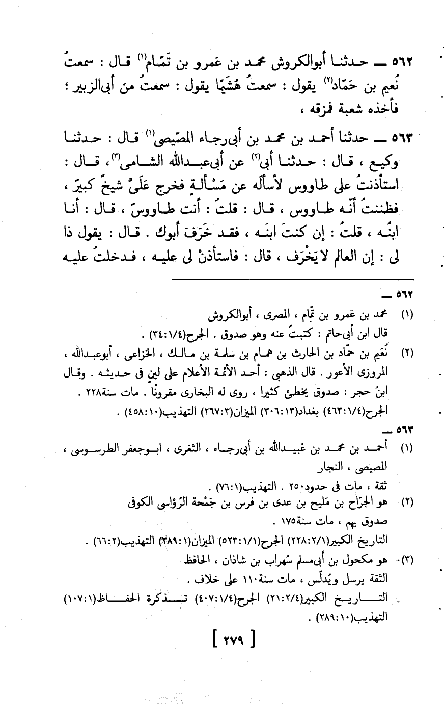 563 - حَدثنَا أَحْمد بن مُحَمَّد بن أبي رَجَاء المصِّيصِي , قَالَ: حَدثنَا وَكِيع، قَالَ: حَدثنَا أبي عبد الله الشَّامي، قَالَ: اسْتَأْذَنت على طَاوُوس لأسأله عَن مَسْأَلَة فَخرج عَليّ شيخ كَبِير، فَظَنَنْت أَنه طَاوس، قَالَ: قلت: أَنْت طَاوُوس، قَالَ: أَنا ابْنه، قلت: إِن كنت ابْنه، فقد خرف أَبوك.
