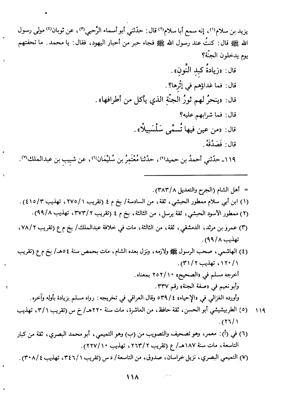 119 - حدثني أحمد بن حميد حدثنا مُعْتَمِرُ بْنُ سُلَيْمَانَ عَنْ شَبِيبِ بْنِ عَبْدِ الْمَلِكِ -[119]- قَالَ حَدَّثَنِي مُقَاتِلُ بْنُ حَيَّانَ قَالَ إِنَّ أَهْلَ الْجَنَّةِ إِذَا دُعُوا بِالطَّعَامِ قَالُوا سُبْحَانَكَ اللَّهُمَّ. قَالَ فَيَقُومُ عَلَى أَحَدِهِمْ عَشَرَةُ آلَافِ خَادِمٍ مَعَ كُلِّ خَادِمٍ مِنْهُمْ صَحْفَةٌ مِنْ ذَهَبٍ فِيهَا طَعَامٌ لَيْسَ فِي الْأُخْرَى فَيَأْكُلُ مِنْهُنَّ كُلِّهِنَّ.