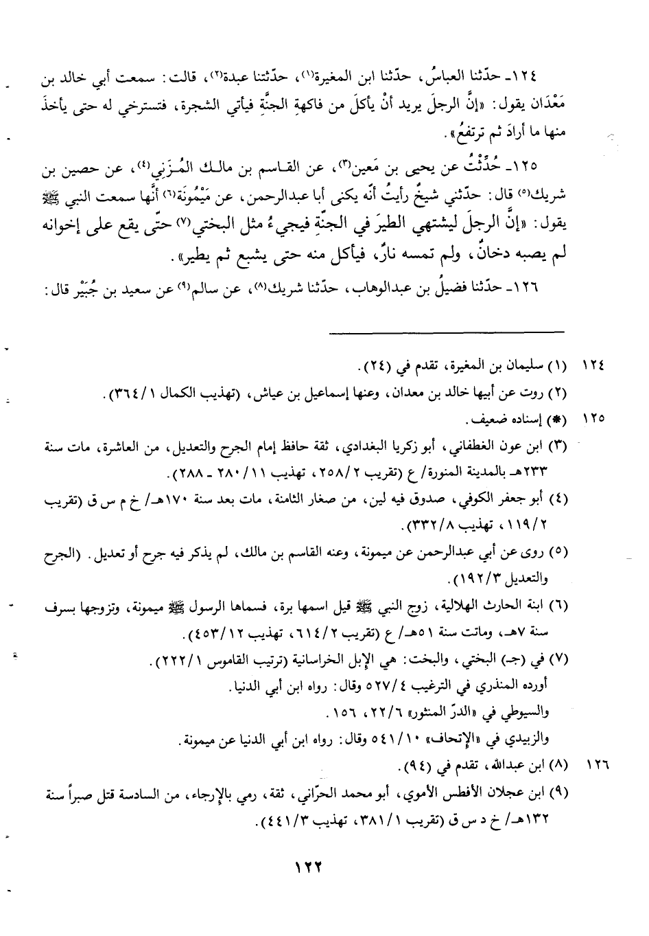 125 - حُدِّثْتُ عَنْ يَحْيَى بْنِ مَعِينٍ عَنِ الْقَاسِمِ بْنِ مَالِكٍ الْمُزَنِيِّ عَنْ حُصَيْنِ بْنِ شَرِيكٍ قَالَ حَدَّثَنِي شَيْخٌ رَأَيْتُ أَنَّهُ يُكَنَّى أَبَا عَبْدِ الرَّحْمَنِ عَنْ مَيْمُونَةَ أَنَّهَا سَمِعَتِ النَّبِيَّ صَلَّى اللَّهُ عَلَيْهِ وَسَلَّمَ يَقُولُ إِنَّ الرَّجُلَ لَيَشْتَهِي الطَّيْرَ فِي الْجَنَّةِ فَيَجِيءُ مِثْلَ الْبُخْتِيِّ حَتَّى يَقَعَ عَلَى إخوانه لَمْ يُصِبْهُ دُخَانٌ وَلَمْ تَمَسَّهُ نَارٌ فَيَأْكُلُ مِنْهُ حَتَّى يَشْبَعَ ثُمَّ يَطِيرُ.
