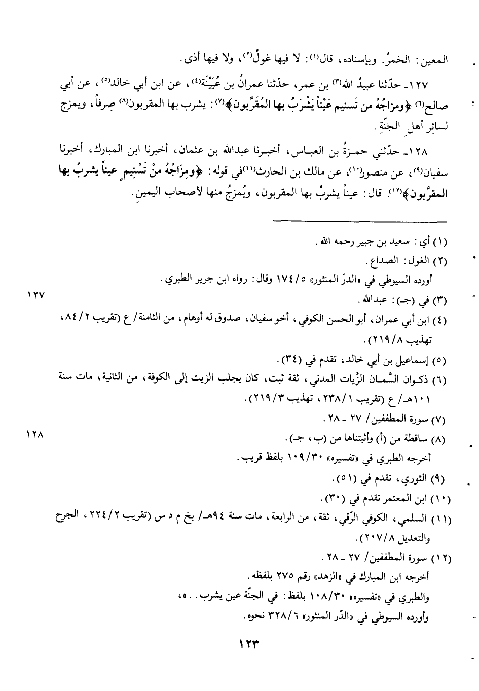 128 - حدثني حَمْزَةُ بْنُ الْعَبَّاسِ أَخْبَرَنَا عَبْدُ الله بن عثمان أخبرنا ابن المبارك أخبرنا سُفْيَانُ عَنْ مَنْصُورٍ عَنْ مَالِكِ بْنِ الْحَارِثِ فِي قَوْلِهِ {وَمِزَاجُهُ مِنْ تَسْنِيمٍ عَيْنًا يَشْرَبُ بِهَا المقربون} قَالَ عَيْنًا يَشْرَبُ بِهَا الْمُقَرَّبُونَ ويمزج منها لِأَصْحَابِ الْيَمِينِ.
