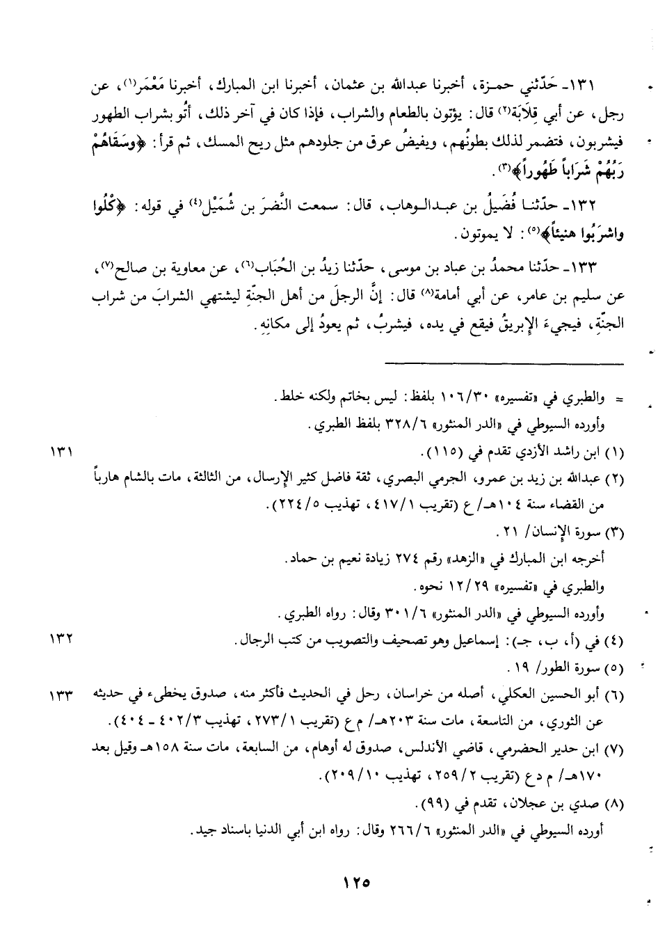 131 - حدثني حمزة أَخْبَرَنَا عَبْدُ اللَّهِ بْنُ عُثْمَانَ أخبرنا ابن المبارك أخبرنا مَعْمَرٌ عَنْ رَجُلٍ عَنْ أَبِي قِلَابَةَ قَالَ يُؤْتَوْنَ بِالطَّعَامِ وَالشَّرَابِ فَإِذَا كَانَ فِي آخِرِ ذَلِكَ أتو بِشَرَابِ الطُّهُورِ فَيَشْرَبُونَ فَتَضْمُرُ لِذَلِكَ بُطُونُهُمْ وَيَفِيضُ عَرَقٌ مِنْ جُلُودِهِمْ مِثْلُ رِيحِ الْمِسْكِ ثُمَّ قَرَأَ {وسقاهم ربهم شرابا طهور}.