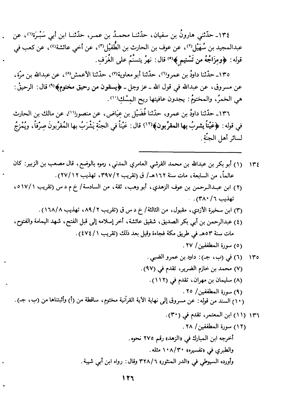 136 - حدثنا داود بن عمرو حدثنا فُضَيْلُ بْنُ عِيَاضٍ عَنْ مَنْصُورٍ عَنْ مَالِكِ بْنِ الْحَارِثِ فِي قَوْلِهِ {عَيْنًا يَشْرَبُ بِهَا الْمُقَرَّبُونَ} قَالَ عَيْنًا فِي الْجَنَّةِ يَشْرَبُ بِهَا الْمُقَرَّبُونَ صِرْفًا وَيُمْزَجُ لِسَائِرِ أَهْلِ الْجَنَّةِ.
