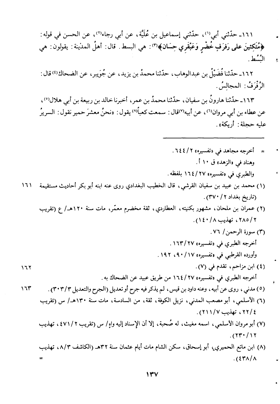 161 - حدثني أبي حدثني إسماعيل بن عُلَيَّةَ عَنْ أَبِي رَجَاءٍ عَنِ الْحَسَنِ فِي قَوْلِهِ {مُتَّكِئِينَ عَلَى رفرف خضر وعبقري حسان} هِيَ الْبُسُطُ. قَالَ أَهْلُ الْمَدِينَةِ يَقُولُونَ هِيَ الْبُسُطُ.