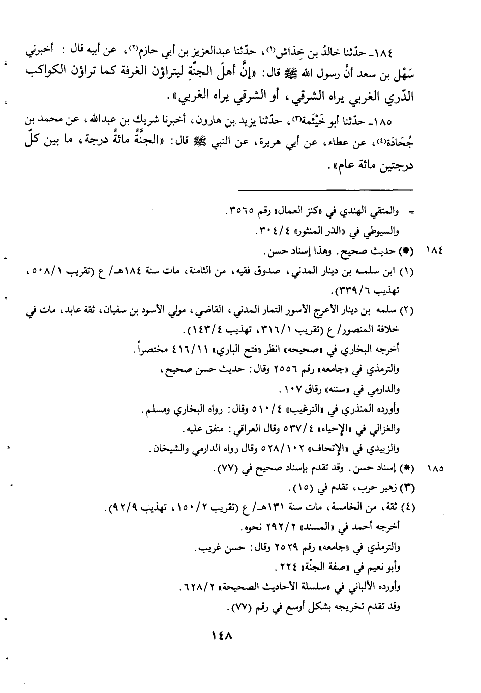 184 - حَدَّثَنَا خالد بن خداش حدثنا عَبْدُ الْعَزِيزِ بْنُ أَبِي حَازِمٍ عَنْ أَبِيهِ قَالَ أَخْبَرَنِي سَهْلُ بْنُ سَعْدٍ أَنَّ رَسُولَ اللَّهِ صَلَّى اللَّهُ عَلَيْهِ وَسَلَّمَ قَالَ إن أهل الجنة ليتراؤن الغرفة كما تراؤن الكواكب الدُّرِّيَّ الْغَرْبِيَّ يَرَاهُ الشَّرْقِيُّ أَوِ الشَّرْقِيَّ يَرَاهُ الْغَرْبِيُّ.