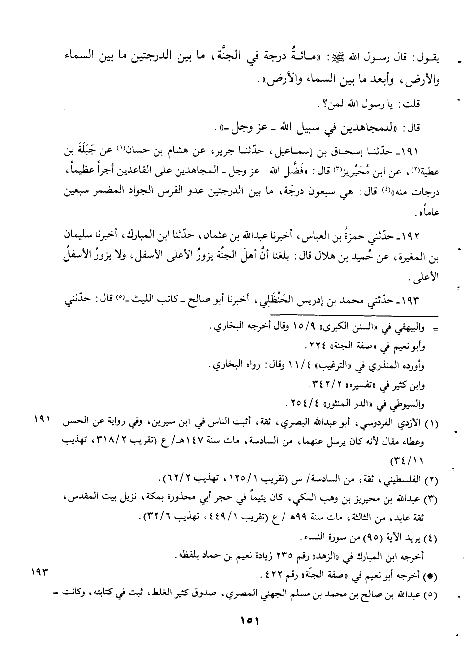 191 - حَدَّثَنَا إِسْحَاقُ بْنُ إِسْمَاعِيلَ حَدَّثَنَا جَرِيرُ عَنْ هِشَامِ بْنِ حَسَّانَ عَنْ جَبَلَةَ بْنِ عَطِيَّةَ عَنْ ابن مُحَيْرِيزٍ قَالَ فَضَّلَ اللَّهُ عَزَّ وَجَلَّ الْمُجَاهِدِينَ عَلَى الْقَاعِدِينَ أَجْرًا عَظِيمًا دَرَجَاتٍ مِنْهُ قَالَ هِيَ سَبْعُونَ دَرَجَةً مَا بَيْنَ الدَّرَجَتَيْنِ عَدْوَ الْفَرَسِ الْجَوَادِ الْمُضْمَرِ سَبْعِينَ عَامًا.