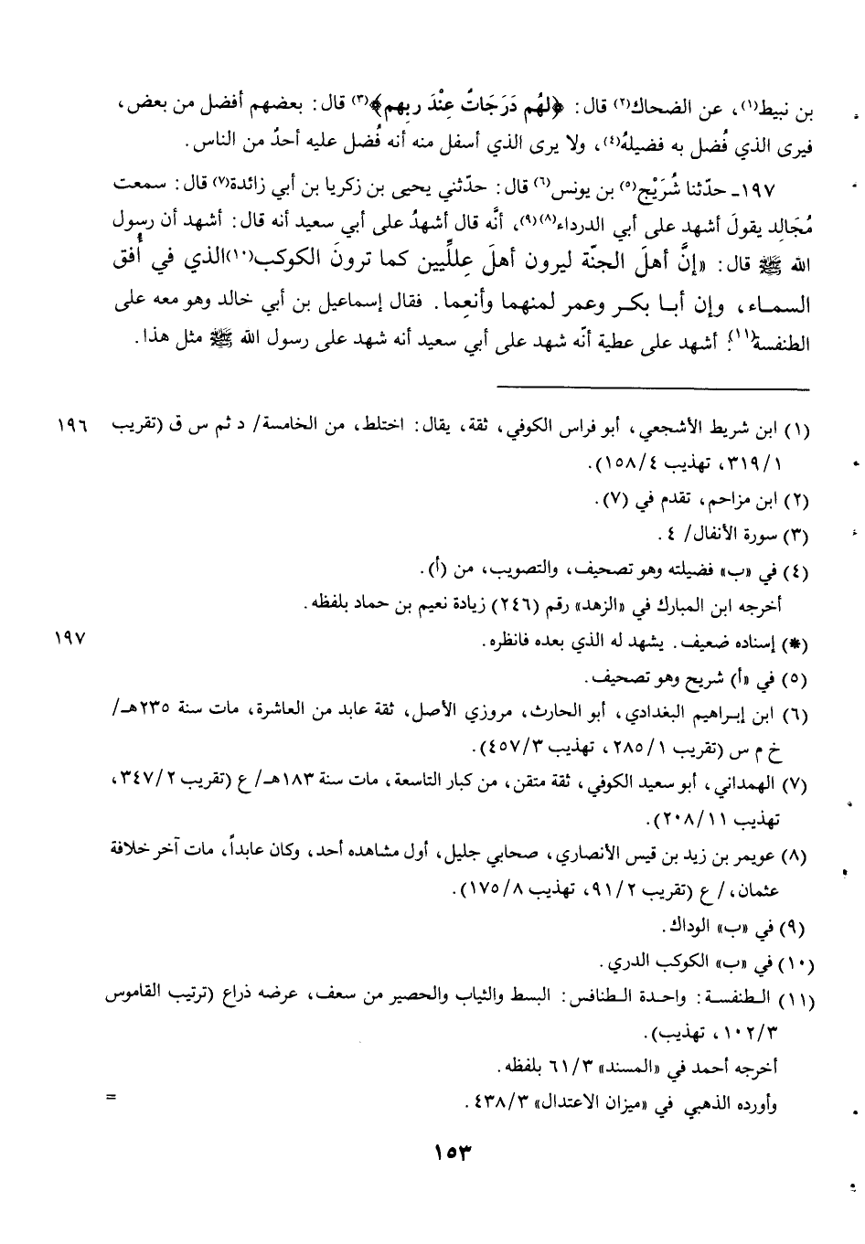 197 - حدثنا شريج بْنُ يُونُسَ قَالَ حَدَّثَنِي يَحْيَى بْنُ زَكَرِيَّا بْنِ أَبِي زَائِدَةَ قال سمعت مجالد يَقُولُ أَشْهَدُ عَلَى أَبِي الدَّرْدَاءِ أَنَّهُ قَالَ أَشْهَدُ عَلَى أَبِي سَعِيدٍ أَنَّهُ قَالَ أَشْهَدُ أَنَّ رَسُولَ اللَّهِ صَلَّى اللَّهُ عَلَيْهِ وَسَلَّمَ قَالَ إِنَّ أَهْلَ الْجَنَّةِ ليرون أهل علليين كَمَا تَرَوْنَ الْكَوْكَبَ الَّذِي فِي أُفُقِ السَّمَاءِ وَإِنَّ أَبَا بَكْرٍ وَعُمَرَ لَمِنْهُمَا وَأَنْعَمَا. فَقَالَ إِسْمَاعِيلُ بْنُ أَبِي خَالِدٍ وَهُوَ مَعَهُ عَلَى الطُّنْفُسَةِ أَشْهَدُ عَلَى عَطِيَّةَ أَنَّهُ شَهِدَ عَلَى أَبِي سَعِيدٍ أَنَّهُ شَهِدَ عَلَى رَسُولِ اللَّهِ صَلَّى اللَّهُ عَلَيْهِ وَسَلَّمَ مِثْلَ هذا.