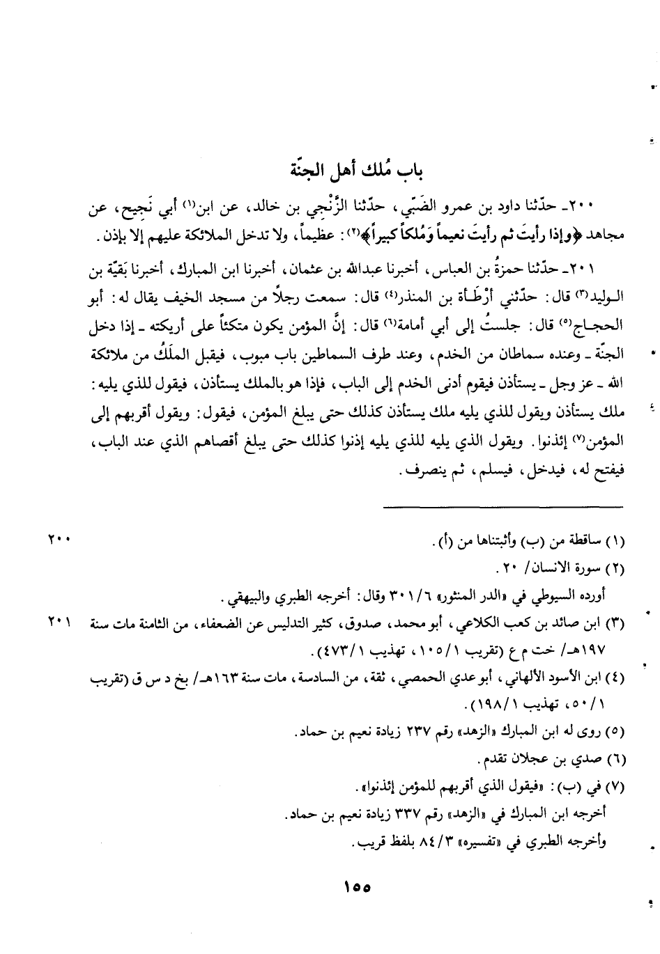 200 - حَدَّثَنَا داود بن عمرو الضبي حدثنا الزَّنْجِيُّ بْنُ خَالِدٍ عَنِ ابْنِ أَبِي نَجِيحٍ عَنْ مُجَاهِدٍ {وَإِذَا رَأَيْتَ ثَمَّ رَأَيْتَ نَعِيمًا وَمُلْكًا كبيرا} عظيما ولا تَدْخُلُ الْمَلَائِكَةُ عَلَيْهِمْ إِلَّا بِإِذْنٍ.