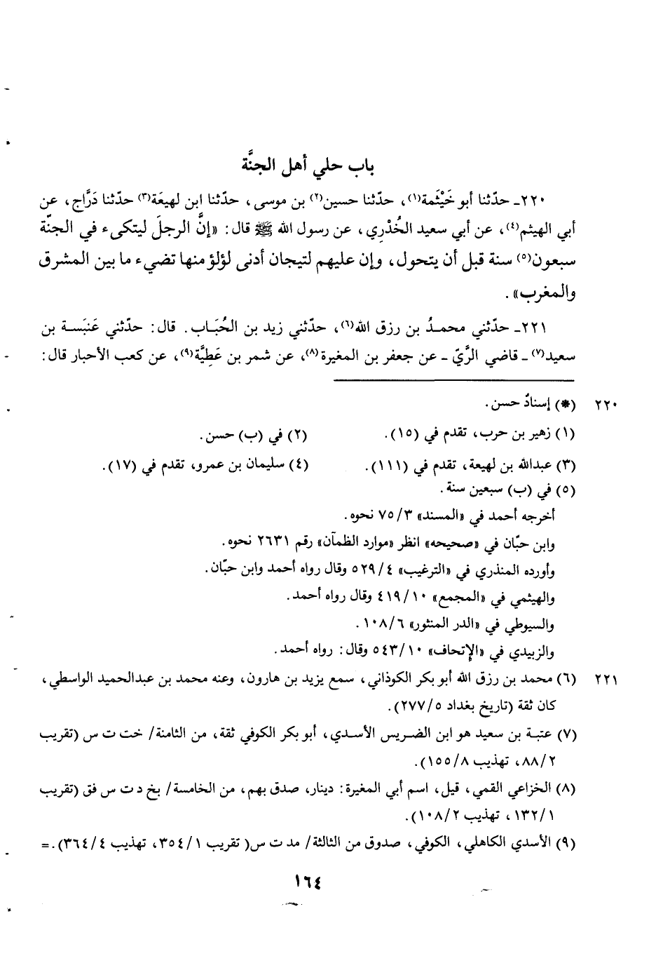 220 - حَدَّثَنَا أبو خيثمة حدثنا حسين بن موسى حدثنا ابن لهيعة حدثنا دَرَّاجٌ عَنْ أَبِي الْهَيْثَمِ عَنْ أَبِي سَعِيدٍ الْخُدْرِيِّ عَنْ رَسُولِ اللَّهِ صَلَّى اللَّهُ عَلَيْهِ وَسَلَّمَ قَالَ إِنَّ الرَّجُلَ لَيَتَّكِئُ فِي الجنة سبعون سَنَةً قَبْلَ أَنْ يَتَحَوَّلَ وَإِنَّ عليهم لتيجان أدنى لؤلؤ منها تُضِيءُ مَا بَيْنَ الْمَشْرِقِ وَالْمَغْرِبِ.