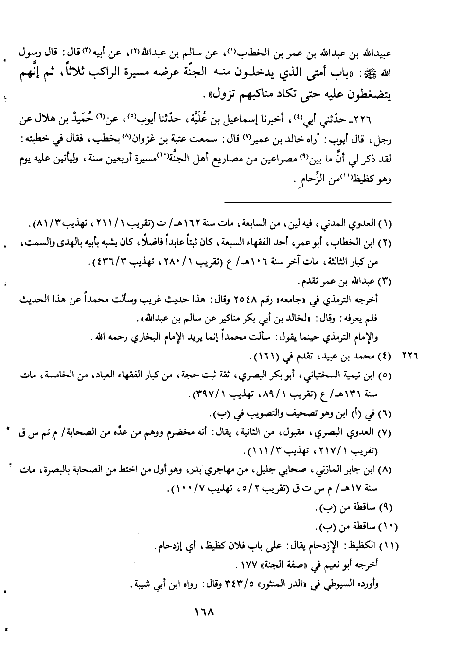 226 - حدثني أبي أخبرنا إسماعيل بن علية حدثنا أيوب عَنْ حُمَيْدِ بْنِ هِلَالٍ عَنْ رجل قال أيوب أراه خَالِدَ بْنَ عُمَيْرٍ قَالَ سَمِعْتُ عُتْبَةَ بْنَ غَزْوَانَ يَخْطُبُ فَقَالَ في خطبته لقد ذُكِرَ لِي أَنَّ مَا بَيْنَ مِصْرَاعَيْنِ منْ مَصَارِيعِ أَهْلِ الْجَنَّةِ مَسِيرَةُ أَرْبَعِينَ سَنَةً وَلَيَأْتِيَنَّ عَلَيْهِ يَوْمٌ وَهُوَ كَظِيظٌ مِنَ الزِّحَامِ.