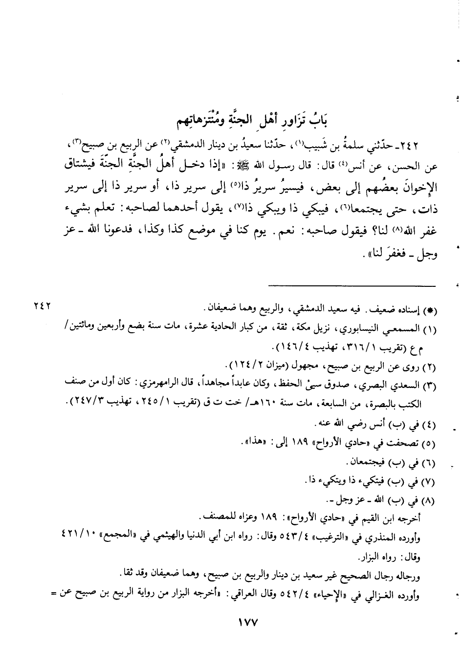242 - حدثني سلمة بن شبيب حدثنا سَعِيدُ بْنُ دِينَارٍ الدِّمَشْقِيُّ عَنِ الرَّبِيعِ بْنِ صَبِيحٍ عَنِ الْحَسَنِ عَنْ أَنَسٍ قَالَ قَالَ رَسُولُ اللَّهِ صَلَّى اللَّهُ عَلَيْهِ وَسَلَّمَ إِذَا دَخَلَ أَهْلُ الْجَنَّةِ الْجَنَّةَ فَيَشْتَاقُ الْإِخْوَانُ بَعْضُهُمْ إِلَى بَعْضٍ فَيَسِيرُ سَرِيرُ ذَا إِلَى سَرِيرِ ذا أو سرير ذا إلى سرير ذات حَتَّى يَجْتَمِعَا فَيَبْكِي ذَا وَيَبْكِي ذَا يَقُولُ أَحَدُهُمَا لِصَاحِبِهِ تَعْلَمُ بشيء غَفَرَ اللَّهُ لَنَا فَيَقُولُ صَاحِبُهُ نَعَمْ. يَوْمَ كُنَّا فِي مَوْضِعِ كَذَا وَكَذَا فَدَعَوْنَا اللَّهَ عَزَّ وَجَلَّ فَغَفَرَ لَنَا.