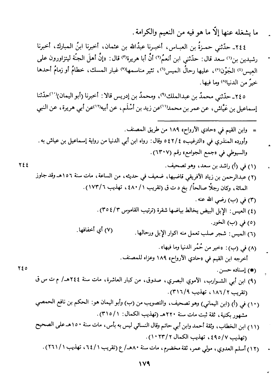 244 - حدثني حَمْزَةُ بْنُ الْعَبَّاسِ أَخْبَرَنَا عَبْدُ الله بن عثمان أخبرنا ابن المبارك أخبرنا رشيدين بْنُ سَعْدٍ قَالَ حَدَّثَنِي ابْنُ أَنْعُمٍ أَنَّ أَبَا هُرَيْرَةَ قَالَ إِنَّ أَهْلَ الْجَنَّةِ لَيَتَزَاوَرُونَ عَلَى الْعِيسِ الْجُونِ عَلَيْهَا رِحَالُ الْمِيسِ تُثِيرُ مَنَاسِمُهَا غُبَارَ الْمِسْكِ خِطَامُ أو زمام أحدها خَيْرٌ مِنَ الدُّنْيَا وَمَا فِيهَا.