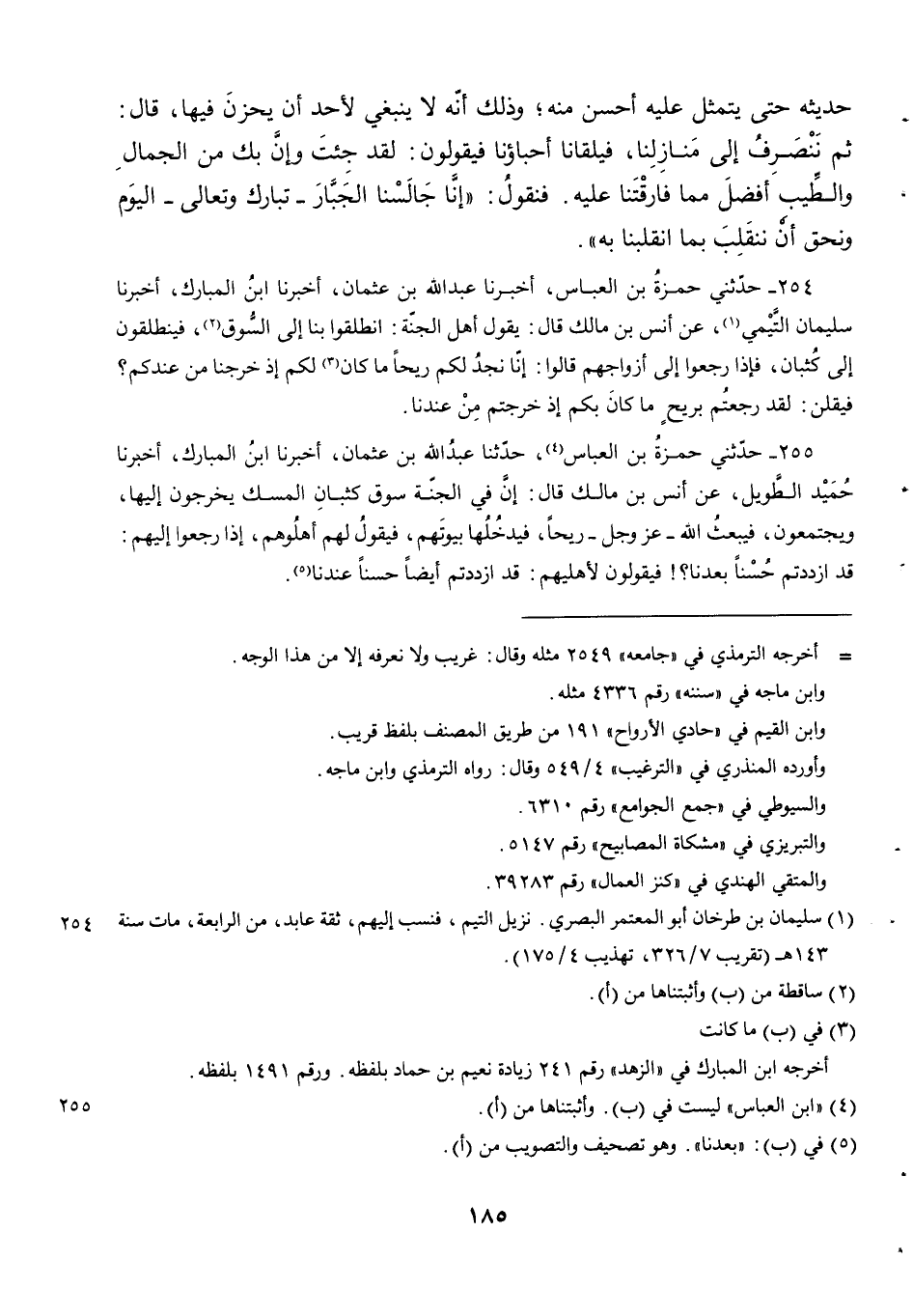 254 - حَدَّثَنِي حَمْزَةُ بْنُ الْعَبَّاسِ أَخْبَرَنَا عَبْدُ الله بن عثمان أخبرنا ابن المبارك أخبرنا سُلَيْمَانُ التَّيْمِيُّ عَنْ أَنَسِ بْنِ مَالِكٍ قَالَ يَقُولُ أَهْلُ الْجَنَّةِ انْطَلِقُوا بِنَا إِلَى السُّوقِ فَيَنْطَلِقُونَ إلى كثبان فَإِذَا رَجَعُوا إِلَى أَزْوَاجِهِمْ قَالُوا إِنَّا نَجِدُ لَكُمْ رِيحًا مَا كَانَ لَكُمْ إِذْ خَرَجْنَا مِنْ عِنْدِكُمْ فَيَقُلْنَ لَقَدْ رَجَعْتُمْ بِرِيحٍ مَا كَانَ بِكُمْ إِذْ خَرَجْتُمْ مِنْ عِنْدِنَا.