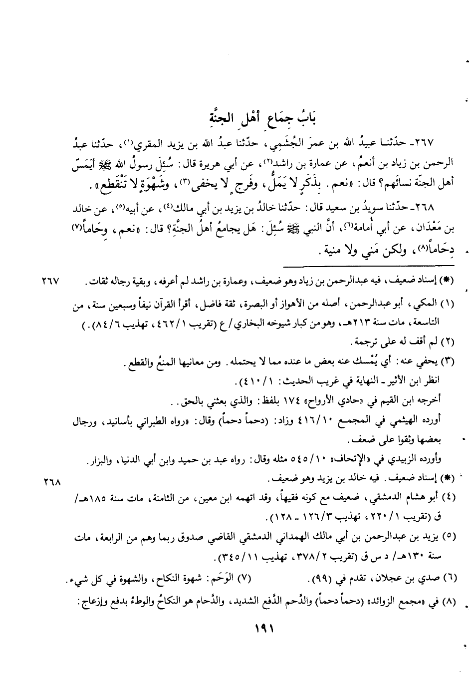 267 - حَدَّثَنَا عُبَيْدُ اللَّهِ بْنُ عُمَرَ الْجُشَمِيُّ حدثنا عبد الله بن يزيد المقري حدثنا عَبْدُ الرَّحْمَنِ بْنُ زِيَادِ بْنِ أَنْعَمٍ عَنْ عُمَارَةَ بْنِ رَاشِدٍ عَنْ أَبِي هُرَيْرَةَ قَالَ سُئِلَ رَسُولَ اللَّهِ صَلَّى اللَّهُ عَلَيْهِ وسلم أيمس أهل الجنة نسائهم قَالَ نَعَمْ. بِذَكَرٍ لَا يَمَلُّ وفرج لا يخفى وَشَهْوَةٍ لَا تَنْقَطِعُ.