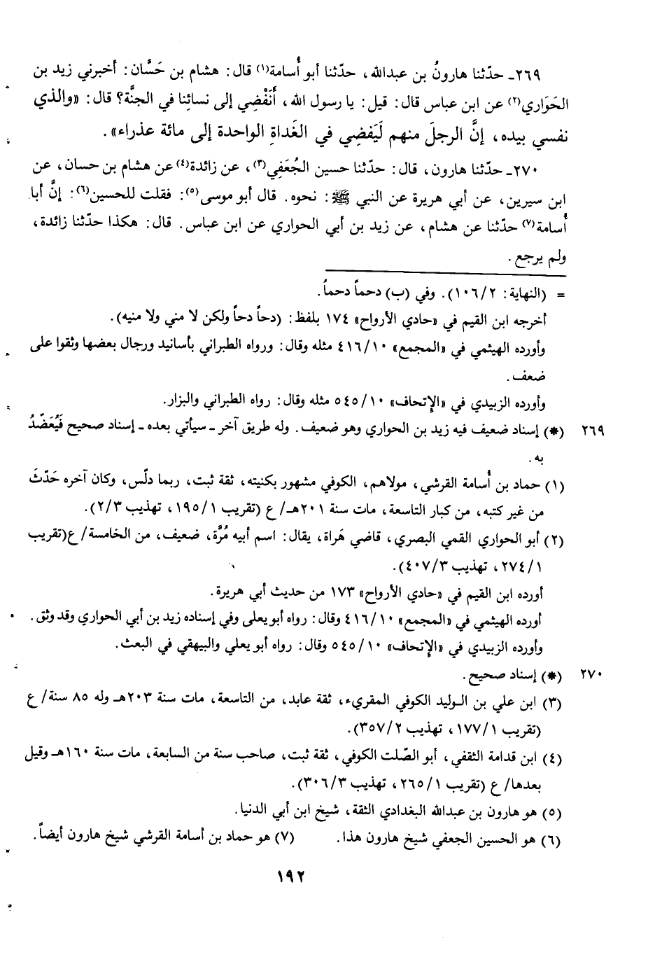 269 - حَدَّثَنَا هارون بن عبد الله حدثنا أَبُو أُسَامَةَ قَالَ هِشَامُ بْنُ حسان أخبرني زَيْدِ بْنِ الْحَوَارِيِّ عَنِ ابْنِ عَبَّاسٍ قَالَ قِيلَ يَا رَسُولَ اللَّهِ أَنُفْضِي إِلَى نِسَائِنَا فِي الْجَنَّةِ قَالَ وَالَّذِي نَفْسِي بِيَدِهِ إِنَّ الرَّجُلَ مِنْهُمْ لَيُفْضِي فِي الْغَدَاةِ الْوَاحِدَةِ إِلَى مِائَةِ عَذْرَاءَ.